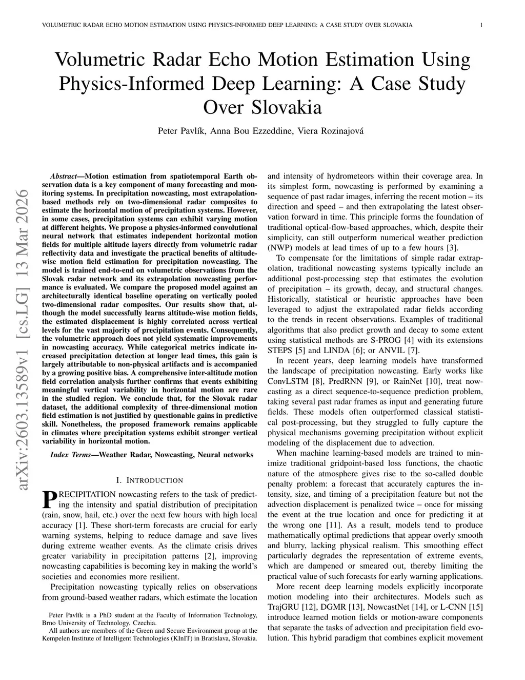 Volumetric Radar Echo Motion Estimation Using Physics-Informed Deep Learning: A Case Study Over Slovakia