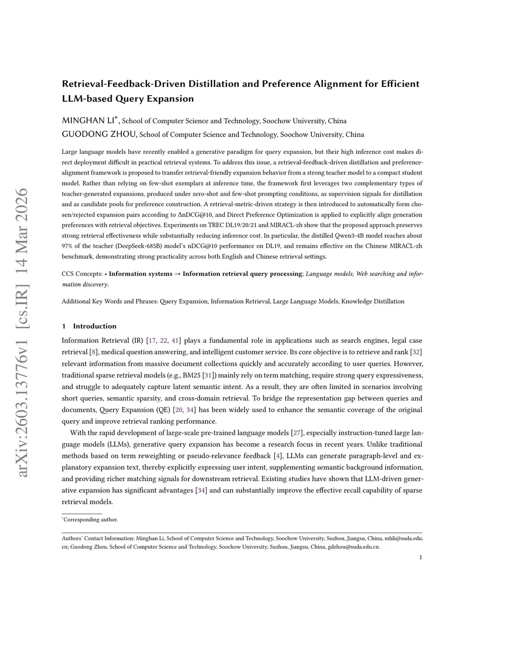 Large language models have recently enabled a generative paradigm for query expansion, but their high inference cost makes direct deployment difficult in practical retrieval systems. To address this issue, a retrieval-feedback-driven distillation and preference-alignment framework is proposed to transfer retrieval-friendly expansion behavior from a strong teacher model to a compact student model. Rather than relying on few-shot exemplars at inference time, the framework first leverages two complementary types of teacher-generated expansions, produced under zero-shot and few-shot prompting conditions, as supervision signals for distillation and as candidate pools for preference construction. A retrieval-metric-driven strategy is then introduced to automatically form chosen/rejected expansion pairs according to nDCG@10 differences, and Direct Preference Optimization is applied to explicitly align generation preferences with retrieval objectives. Experiments on TREC DL19/20/21 and MIRACL-zh show that the proposed approach preserves strong retrieval effectiveness while substantially reducing inference cost. In particular, the distilled Qwen3-4B model reaches about 97% of the teacher (DeepSeek-685B) model's nDCG@10 performance on DL19, and remains effective on the Chinese MIRACL-zh benchmark, demonstrating strong practicality across both English and Chinese retrieval settings.