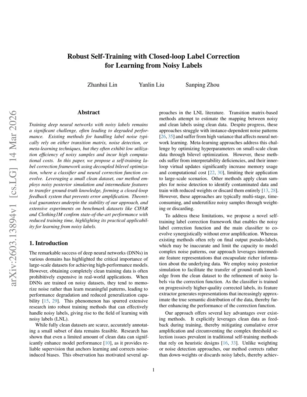 Training deep neural networks with noisy labels remains a significant challenge, often leading to degraded performance. Existing methods for handling label noise typically rely on either transition matrix, noise detection, or meta-learning techniques, but they often exhibit low utilization efficiency of noisy samples and incur high computational costs. In this paper, we propose a self-training label correction framework using decoupled bilevel optimization, where a classifier and neural correction function co-evolve. Leveraging a small clean dataset, our method employs noisy posterior simulation and intermediate features to transfer ground-truth knowledge, forming a closed-loop feedback system that prevents error amplification. Theoretical guarantees underpin the stability of our approach, and extensive experiments on benchmark datasets like CIFAR and Clothing1M confirm state-of-the-art performance with reduced training time, highlighting its practical applicability for learning from noisy labels.