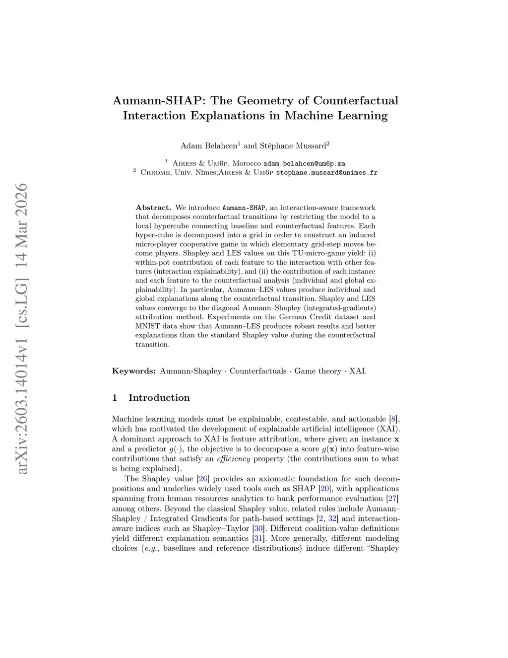 We introduce Aumann-SHAP, an interaction-aware framework that decomposes counterfactual transitions by restricting the model to a local hypercube connecting baseline and counterfactual features. Each hyper-cube is decomposed into a grid in order to construct an induced micro-player cooperative game in which elementary grid-step moves become players. Shapley and LES values on this TU-micro-game yield: (i) within-pot contribution of each feature to the interaction with other features (interaction explainability), and (ii) the contribution of each instance and each feature to the counterfactual analysis (individual and global explainability). In particular, Aumann-LES values produce individual and global explanations along the counterfactual transition. Shapley and LES values converge to the diagonal Aumann-Shapley (integrated-gradients) attribution method. Experiments on the German Credit dataset and MNIST data show that Aumann-LES produces robust results and better explanations than the standard Shapley value during the counterfactual transition.