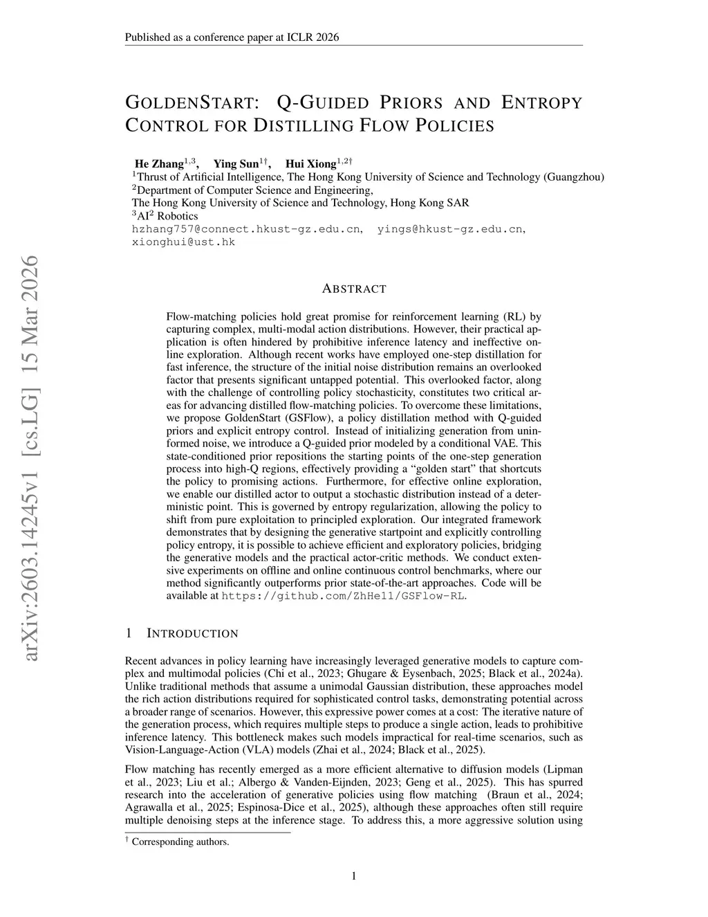 Flow-matching policies hold great promise for reinforcement learning (RL) by capturing complex, multi-modal action distributions. However, their practical application is often hindered by prohibitive inference latency and ineffective online exploration. Although recent works have employed one-step distillation for fast inference, the structure of the initial noise distribution remains an overlooked factor that presents significant untapped potential. This overlooked factor, along with the challenge of controlling policy stochasticity, constitutes two critical areas for advancing distilled flow-matching policies. To overcome these limitations, we propose GoldenStart (GSFlow), a policy distillation method with Q-guided priors and explicit entropy control. Instead of initializing generation from uninformed noise, we introduce a Q-guided prior modeled by a conditional VAE. This state-conditioned prior repositions the starting points of the one-step generation process into high-Q regions, effectively providing a "golden start" that shortcuts the policy to promising actions. Furthermore, for effective online exploration, we enable our distilled actor to output a stochastic distribution instead of a deterministic point. This is governed by entropy regularization, allowing the policy to shift from pure exploitation to principled exploration. Our integrated framework demonstrates that by designing the generative startpoint and explicitly controlling policy entropy, it is possible to achieve efficient and exploratory policies, bridging the generative models and the practical actor-critic methods. We conduct extensive experiments on offline and online continuous control benchmarks, where our method significantly outperforms prior state-of-the-art approaches. Code will be available atthis https URL.