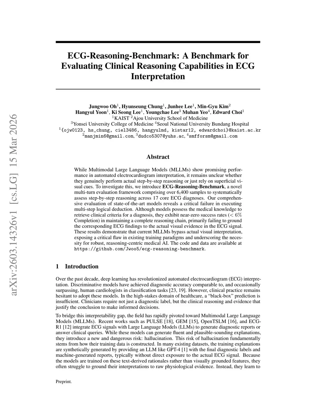 While Multimodal Large Language Models (MLLMs) show promising performance in automated electrocardiogram interpretation, it remains unclear whether they genuinely perform actual step-by-step reasoning or just rely on superficial visual cues. To investigate this, we introduce \textbf{ECG-Reasoning-Benchmark}, a novel multi-turn evaluation framework comprising over 6,400 samples to systematically assess step-by-step reasoning across 17 core ECG diagnoses. Our comprehensive evaluation of state-of-the-art models reveals a critical failure in executing multi-step logical deduction. Although models possess the medical knowledge to retrieve clinical criteria for a diagnosis, they exhibit near-zero success rates (6% Completion) in maintaining a complete reasoning chain, primarily failing to ground the corresponding ECG findings to the actual visual evidence in the ECG signal. These results demonstrate that current MLLMs bypass actual visual interpretation, exposing a critical flaw in existing training paradigms and underscoring the necessity for robust, reasoning-centric medical AI. The code and data are available atthis https URL.