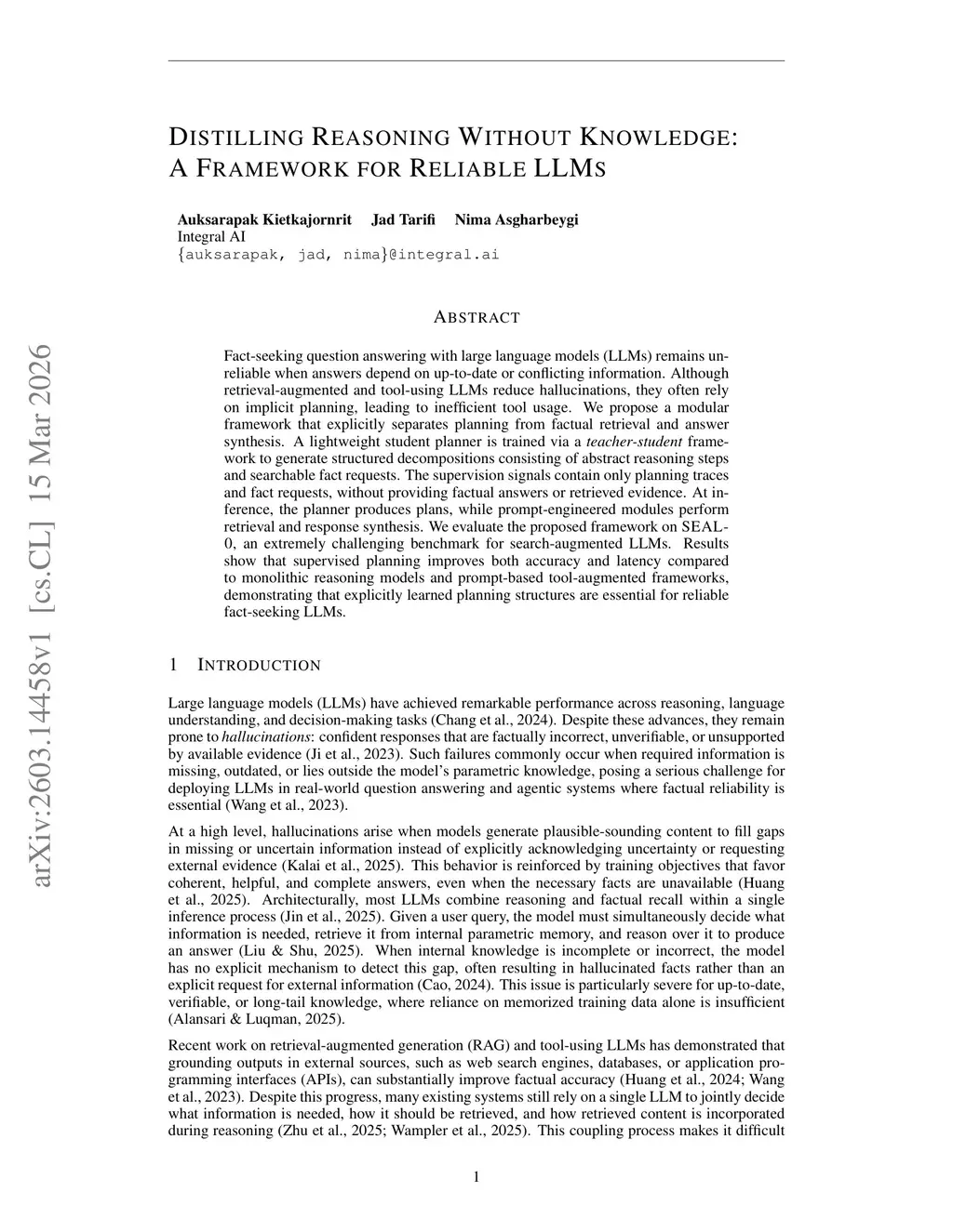 Fact-seeking question answering with large language models (LLMs) remains unreliable when answers depend on up-to-date or conflicting information. Although retrieval-augmented and tool-using LLMs reduce hallucinations, they often rely on implicit planning, leading to inefficient tool usage. We propose a modular framework that explicitly separates planning from factual retrieval and answer synthesis. A lightweight student planner is trained via a teacher-student framework to generate structured decompositions consisting of abstract reasoning steps and searchable fact requests. The supervision signals contain only planning traces and fact requests, without providing factual answers or retrieved evidence. At inference, the planner produces plans, while prompt-engineered modules perform retrieval and response synthesis. We evaluate the proposed framework on SEAL-0, an extremely challenging benchmark for search-augmented LLMs. Results show that supervised planning improves both accuracy and latency compared to monolithic reasoning models and prompt-based tool-augmented frameworks, demonstrating that explicitly learned planning structures are essential for reliable fact-seeking LLMs.