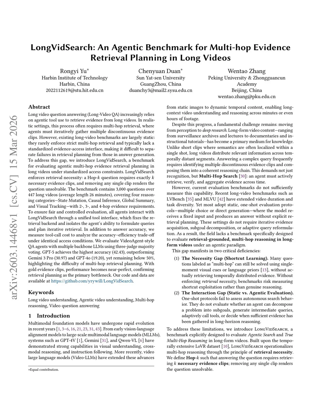 Long video question answering (Long-Video QA) increasingly relies on agentic tool use to retrieve evidence from long videos. In realistic settings, this process often requires multi-hop retrieval, where agents must iteratively gather multiple discontinuous evidence clips. However, existing long-video benchmarks are largely static: they rarely enforce strict multi-hop retrieval and typically lack a standardized evidence-access interface, making it difficult to separate failures in retrieval planning from those in answer generation. To address this gap, we introduce LongVidSearch, a benchmark for evaluating agentic multi-hop evidence retrieval planning in long videos under standardized access constraints. LongVidSearch enforces retrieval necessity: a Hop-k question requires exactly k necessary evidence clips, and removing any single clip renders the question unsolvable. The benchmark contains 3,000 questions over 447 long videos (average length 26 minutes), covering four reasoning categories: State Mutation, Causal Inference, Global Summary, and Visual Tracking, with 2-hop, 3-hop, and 4-hop evidence requirements. To ensure fair and controlled evaluation, all agents interact with LongVidSearch through a unified tool interface, which fixes the retrieval backend and isolates the agent's ability to formulate queries and plan iterative retrieval. In addition to answer accuracy, we measure tool-call cost to analyze the accuracy-efficiency trade-off under identical access conditions. We evaluate VideoAgent-style QA agents with multiple backbone LLMs using three-judge majority voting. GPT-5 achieves the highest accuracy (42.43), outperforming Gemini 3 Pro (30.97) and GPT-4o (19.20), yet remaining below 50 %, highlighting the difficulty of multi-hop retrieval planning. With gold evidence clips, performance becomes near-perfect, confirming retrieval planning as the primary bottleneck.