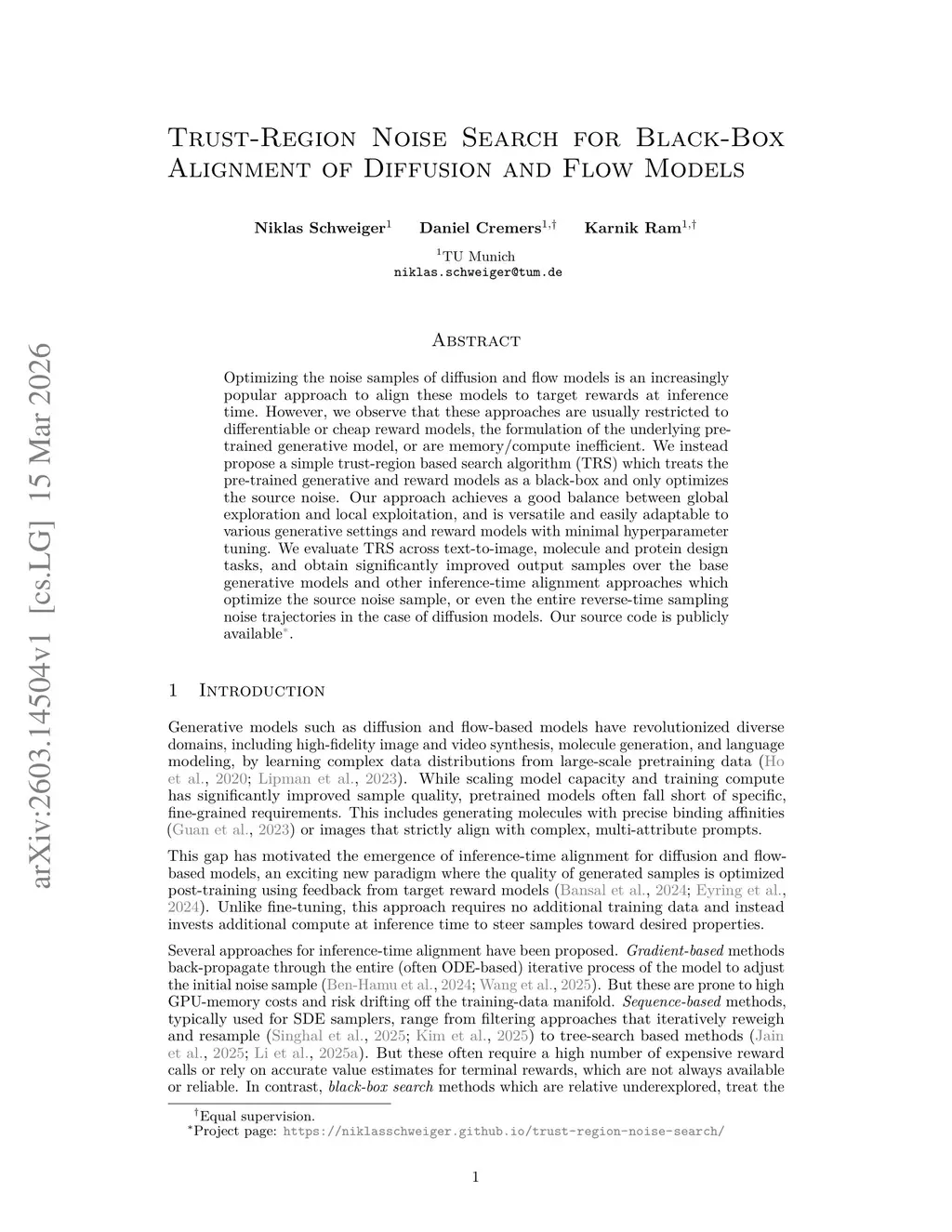 Optimizing the noise samples of diffusion and flow models is an increasingly popular approach to align these models to target rewards at inference time. However, we observe that these approaches are usually restricted to differentiable or cheap reward models, the formulation of the underlying pretrained generative model, or are memory/compute inefficient. We instead propose a simple trust-region based search algorithm (TRS) which treats the pre-trained generative and reward models as a black-box and only optimizes the source noise. Our approach achieves a good balance between global exploration and local exploitation, and is versatile and easily adaptable to various generative settings and reward models with minimal hyperparameter tuning. We evaluate TRS across text-to-image, molecule and protein design tasks, and obtain significantly improved output samples over the base generative models and other inference-time alignment approaches which optimize the source noise sample, or even the entire reverse-time sampling noise trajectories in the case of diffusion models. Our source code is publicly available.