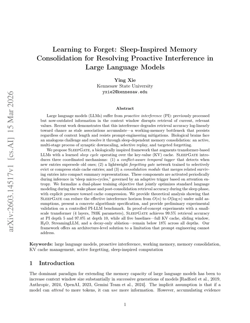 Large language models (LLMs) suffer from proactive interference (PI): outdated information in the context window disrupts retrieval of current values. This interference degrades retrieval accuracy log-linearly as stale associations accumulate, a bottleneck that persists regardless of context length and resists prompt-engineering mitigations. Biological brains resolve an analogous challenge through sleep-dependent memory consolidation: synaptic downscaling, selective replay, and targeted forgetting. We propose SleepGate, a biologically inspired framework that augments transformer-based LLMs with a learned sleep cycle over the key-value (KV) cache. SleepGate introduces three mechanisms: (1) a conflict-aware temporal tagger detecting when new entries supersede old ones; (2) a lightweight forgetting gate trained to selectively evict or compress stale cache entries; and (3) a consolidation module that merges surviving entries into compact summaries. These components activate periodically during inference in sleep micro-cycles, governed by an adaptive entropy-based trigger. We formalize a dual-phase training objective jointly optimizing language modeling during the wake phase and post-consolidation retrieval during the sleep phase. Theoretical analysis shows SleepGate reduces the interference horizon from O(n) to O(log n). In experiments with a small-scale transformer (4 layers, 793K parameters), SleepGate achieves 99.5% retrieval accuracy at PI depth 5 and 97.0% at depth 10, while all five baselines -- full KV cache, sliding window, H2O, StreamingLLM, and decay-only ablation -- remain below 18%. Our framework offers an architecture-level solution that prompt engineering cannot address.