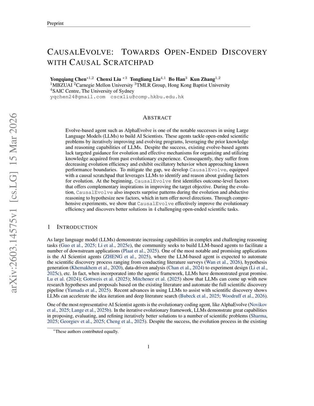 Evolve-based agent such as AlphaEvolve is one of the notable successes in using Large Language Models (LLMs) to build AI Scientists. These agents tackle open-ended scientific problems by iteratively improving and evolving programs, leveraging the prior knowledge and reasoning capabilities of LLMs. Despite the success, existing evolve-based agents lack targeted guidance for evolution and effective mechanisms for organizing and utilizing knowledge acquired from past evolutionary experience. Consequently, they suffer from decreasing evolution efficiency and exhibit oscillatory behavior when approaching known performance boundaries. To mitigate the gap, we develop CausalEvolve, equipped with a causal scratchpad that leverages LLMs to identify and reason about guiding factors for evolution. At the beginning, CausalEvolve first identifies outcome-level factors that offer complementary inspirations in improving the target objective. During the evolution, CausalEvolve also inspects surprise patterns during the evolution and abductive reasoning to hypothesize new factors, which in turn offer novel directions. Through comprehensive experiments, we show that CausalEvolve effectively improves the evolutionary efficiency and discovers better solutions in 4 challenging open-ended scientific tasks.