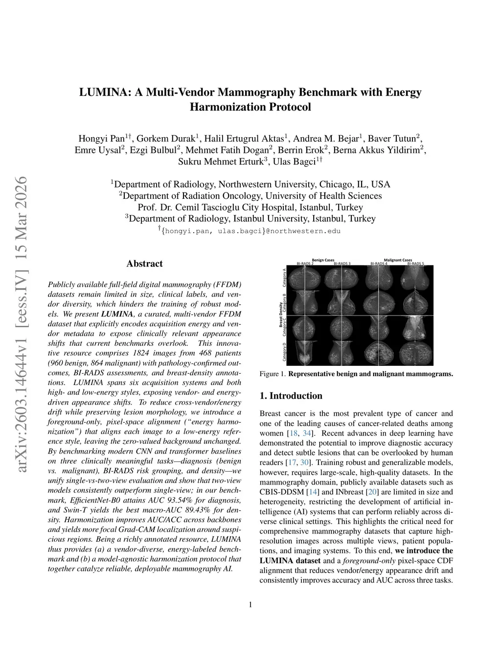 Publicly available full-field digital mammography (FFDM) datasets remain limited in size, clinical annotations, and vendor diversity, hindering the development of robust models. We introduce LUMINA, a curated, multi-vendor FFDM dataset that explicitly encodes acquisition energy and vendor metadata to capture clinically relevant appearance variations often overlooked in existing benchmarks. This dataset contains 1824 images from 468 patients (960 benign, 864 malignant), with pathology-confirmed labels, BI-RADS assessments, and breast-density annotations. LUMINA spans six acquisition systems and includes both high- and low-energy imaging styles, enabling systematic analysis of vendor- and energy-induced domain shifts. To address these variations, we propose a foreground-only pixel-space alignment method ('énergy harmonization'') that maps images to a low-energy reference while preserving lesion morphology. We benchmark CNN and transformer models on three clinically relevant tasks: diagnosis (benign vs. malignant), BI-RADS classification, and density estimation. Two-view models consistently outperform single-view models. EfficientNet-B0 achieves an AUC of 93.54% for diagnosis, while Swin-T achieves the best macro-AUC of 89.43% for density prediction. Harmonization improves performance across architectures and produces more localized Grad-CAM responses. Overall, LUMINA provides (1) a vendor-diverse benchmark and (2) a model-agnostic harmonization framework for reliable and deployable mammography AI.