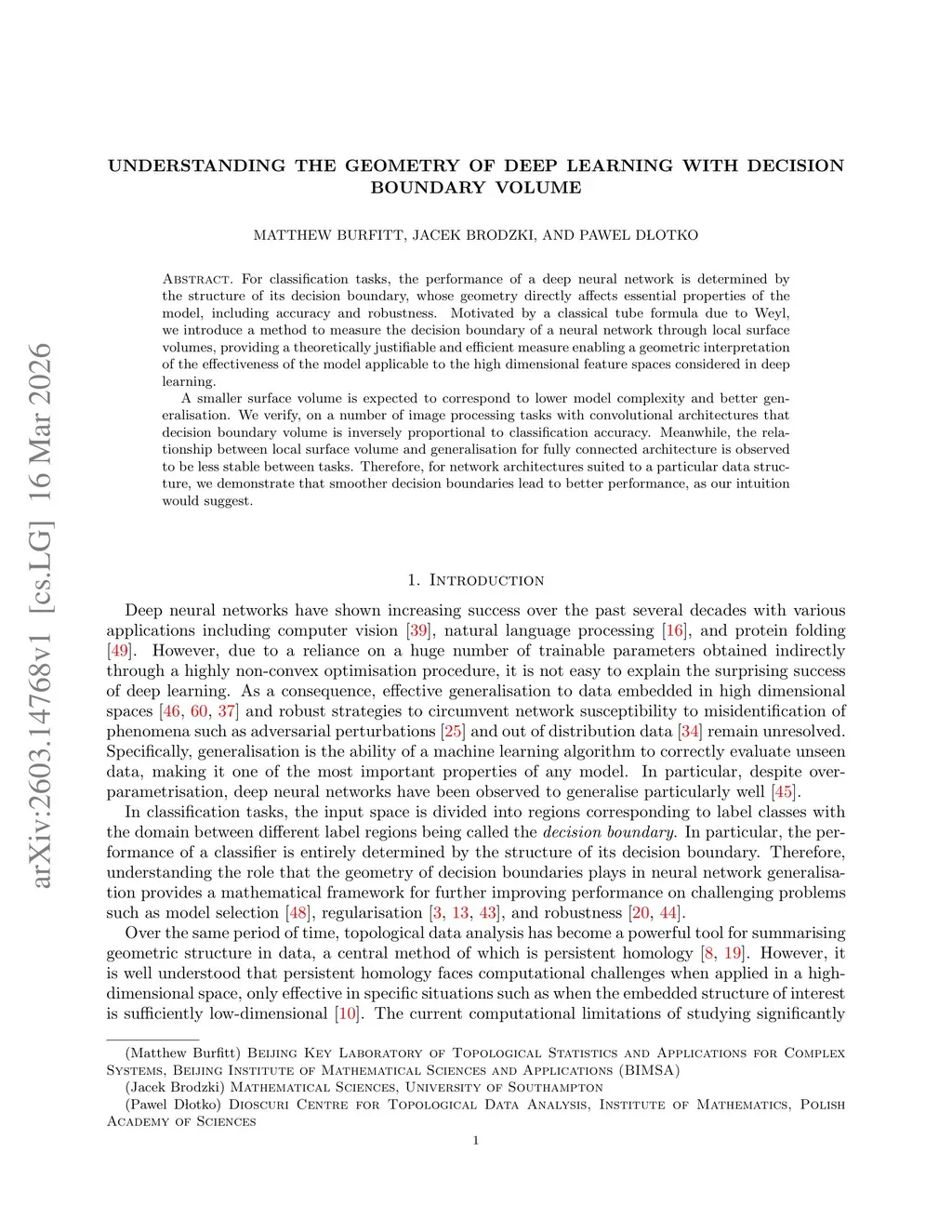 For classification tasks, the performance of a deep neural network is determined by the structure of its decision boundary, whose geometry directly affects essential properties of the model, including accuracy and robustness. Motivated by a classical tube formula due to Weyl, we introduce a method to measure the decision boundary of a neural network through local surface volumes, providing a theoretically justifiable and efficient measure enabling a geometric interpretation of the effectiveness of the model applicable to the high dimensional feature spaces considered in deep learning.A smaller surface volume is expected to correspond to lower model complexity and better generalisation. We verify, on a number of image processing tasks with convolutional architectures that decision boundary volume is inversely proportional to classification accuracy. Meanwhile, the relationship between local surface volume and generalisation for fully connected architecture is observed to be less stable between tasks. Therefore, for network architectures suited to a particular data structure, we demonstrate that smoother decision boundaries lead to better performance, as our intuition would suggest.