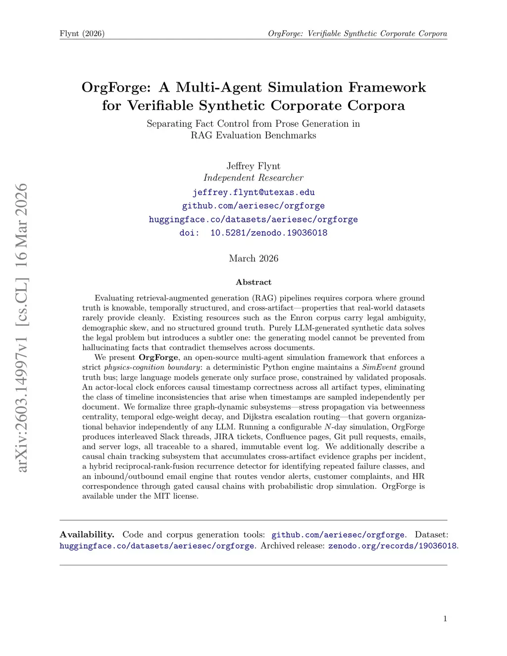 Building and evaluating enterprise AI systems requires synthetic organizational corpora that are internally consistent, temporally structured, and cross-artifact traceable. Existing corpora either carry legal constraints or inherit hallucination artifacts from the generating LLMs, silently corrupting results when timestamps or facts contradict across documents and reinforcing those errors during training. We present OrgForge, an open-source multi-agent simulation framework that enforces a strict physics-cognition boundary: a deterministic Python engine maintains a SimEvent ground-truth bus while LLMs generate only surface prose. OrgForge simulates the organizational processes that produce documents, not the documents themselves. Engineers leave mid-sprint, triggering incident handoffs and CRM ownership lapses. Knowledge gaps emerge when under-documented systems break and recover through organic documentation and incident resolution. Customer emails fire only when simulation state warrants contact; silence is verifiable ground truth. A live CRM state machine extends the physics-cognition boundary to the customer boundary, producing cross-system causal cascades spanning engineering incidents, support escalation, deal risk flagging, and SLA-adjusted invoices. The framework generates fifteen interleaved artifact categories traceable to a shared immutable event log. Four graph-dynamic subsystems govern organizational behavior independently of any LLM. An embedding-based ticket assignment system using the Hungarian algorithm makes the simulation domain-agnostic. An empirical evaluation across ten incidents demonstrates a 0.46 absolute improvement in prose-to-ground-truth fidelity over chained LLM baselines, and isolates a consistent hallucination failure mode in which chaining propagates fabricated facts faithfully across documents without correcting them.