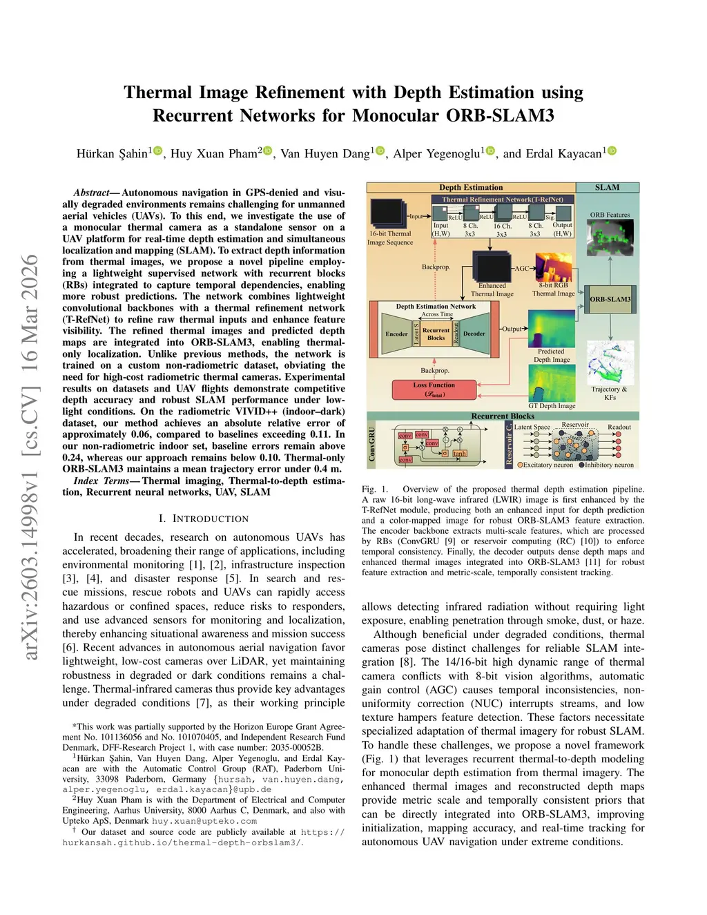 Autonomous navigation in GPS-denied and visually degraded environments remains challenging for unmanned aerial vehicles (UAVs). To this end, we investigate the use of a monocular thermal camera as a standalone sensor on a UAV platform for real-time depth estimation and simultaneous localization and mapping (SLAM). To extract depth information from thermal images, we propose a novel pipeline employing a lightweight supervised network with recurrent blocks (RBs) integrated to capture temporal dependencies, enabling more robust predictions. The network combines lightweight convolutional backbones with a thermal refinement network (T-RefNet) to refine raw thermal inputs and enhance feature visibility. The refined thermal images and predicted depth maps are integrated into ORB-SLAM3, enabling thermal-only localization. Unlike previous methods, the network is trained on a custom non-radiometric dataset, obviating the need for high-cost radiometric thermal cameras. Experimental results on datasets and UAV flights demonstrate competitive depth accuracy and robust SLAM performance under low-light conditions. On the radiometric VIVID++ (indoor-dark) dataset, our method achieves an absolute relative error of approximately 0.06, compared to baselines exceeding 0.11. In our non-radiometric indoor set, baseline errors remain above 0.24, whereas our approach remains below 0.10. Thermal-only ORB-SLAM3 maintains a mean trajectory error under 0.4 m.