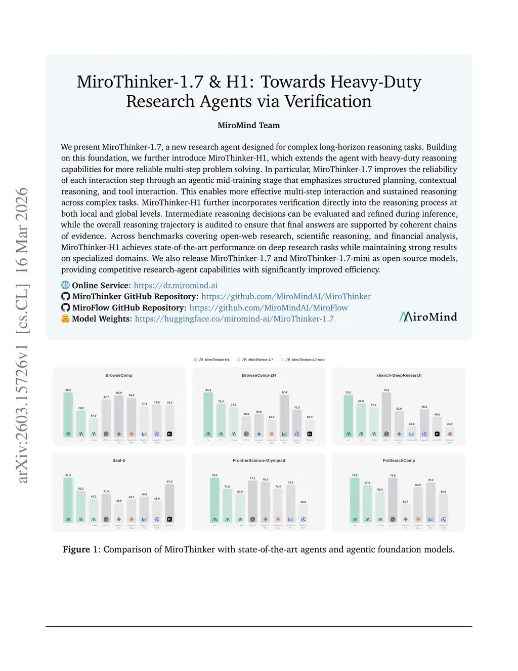 We present MiroThinker-1.7, a new research agent designed for complex long-horizon reasoning tasks. Building on this foundation, we further introduce MiroThinker-H1, which extends the agent with heavy-duty reasoning capabilities for more reliable multi-step problem solving. In particular, MiroThinker-1.7 improves the reliability of each interaction step through an agentic mid-training stage that emphasizes structured planning, contextual reasoning, and tool interaction. This enables more effective multi-step interaction and sustained reasoning across complex tasks. MiroThinker-H1 further incorporates verification directly into the reasoning process at both local and global levels. Intermediate reasoning decisions can be evaluated and refined during inference, while the overall reasoning trajectory is audited to ensure that final answers are supported by coherent chains of evidence. Across benchmarks covering open-web research, scientific reasoning, and financial analysis, MiroThinker-H1 achieves state-of-the-art performance on deep research tasks while maintaining strong results on specialized domains. We also release MiroThinker-1.7 and MiroThinker-1.7-mini as open-source models, providing competitive research-agent capabilities with significantly improved efficiency.