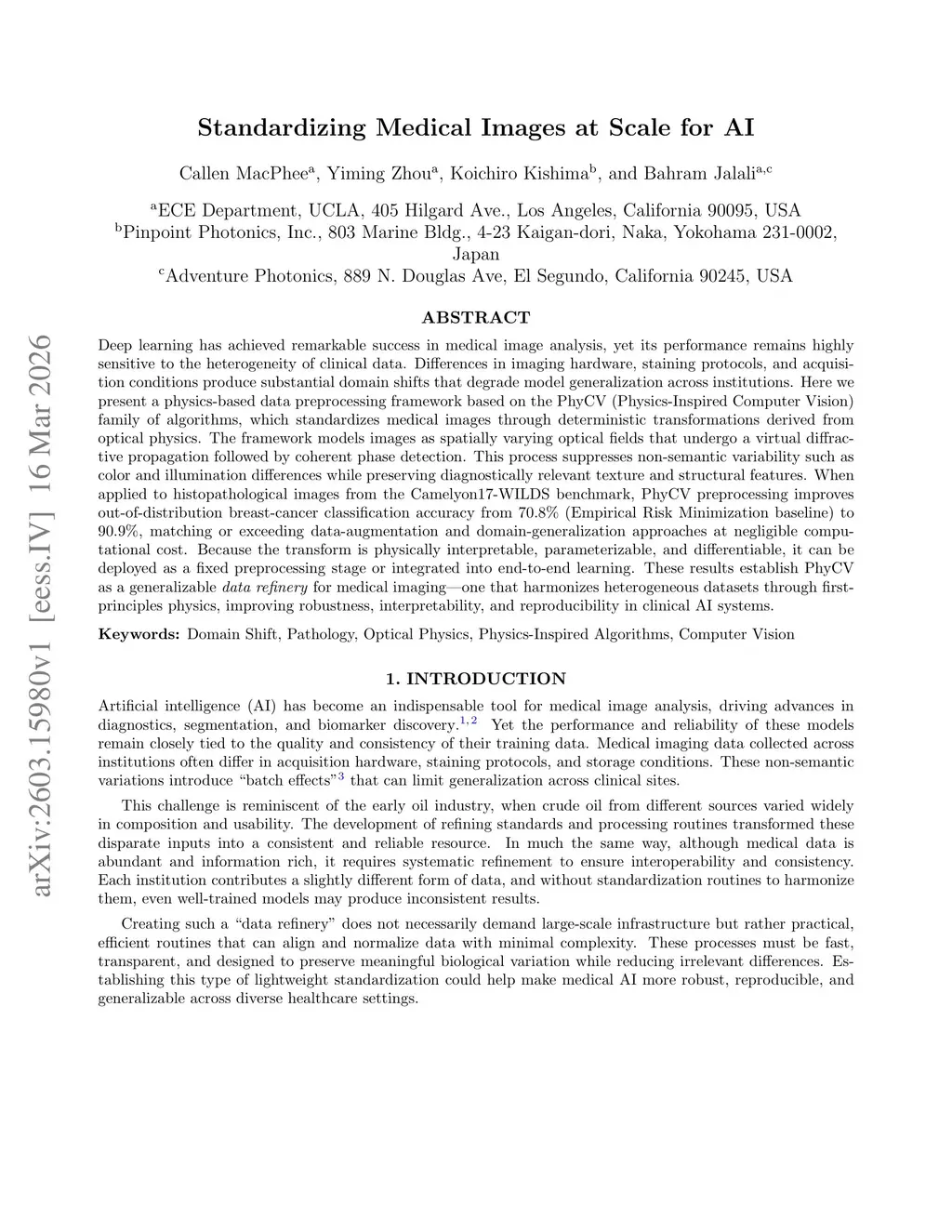 Deep learning has achieved remarkable success in medical image analysis, yet its performance remains highly sensitive to the heterogeneity of clinical data. Differences in imaging hardware, staining protocols, and acquisition conditions produce substantial domain shifts that degrade model generalization across institutions. Here we present a physics-based data preprocessing framework based on the PhyCV (Physics-Inspired Computer Vision) family of algorithms, which standardizes medical images through deterministic transformations derived from optical physics. The framework models images as spatially varying optical fields that undergo a virtual diffractive propagation followed by coherent phase detection. This process suppresses non-semantic variability such as color and illumination differences while preserving diagnostically relevant texture and structural features. When applied to histopathological images from the Camelyon17-WILDS benchmark, PhyCV preprocessing improves out-of-distribution breast-cancer classification accuracy from 70.8% (Empirical Risk Minimization baseline) to 90.9%, matching or exceeding data-augmentation and domain-generalization approaches at negligible computational cost. Because the transform is physically interpretable, parameterizable, and differentiable, it can be deployed as a fixed preprocessing stage or integrated into end-to-end learning. These results establish PhyCV as a generalizable data refinery for medical imaging-one that harmonizes heterogeneous datasets through first-principles physics, improving robustness, interpretability, and reproducibility in clinical AI systems.
