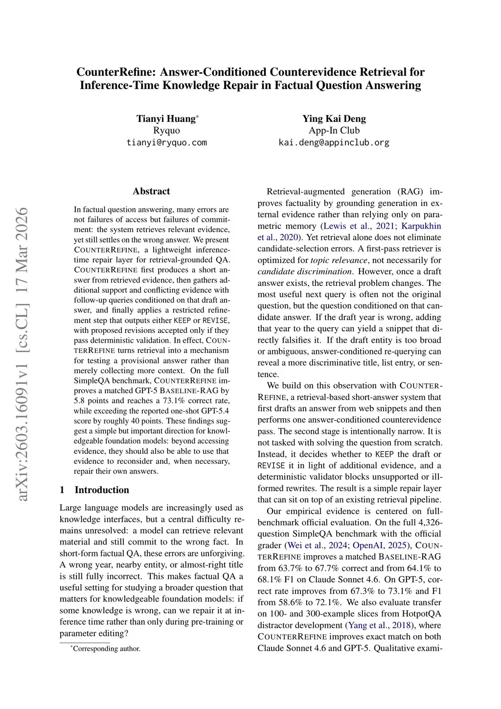 In factual question answering, many errors are not failures of access but failures of commitment: the system retrieves relevant evidence, yet still settles on the wrong answer. We present CounterRefine, a lightweight inference-time repair layer for retrieval-grounded question answering. CounterRefine first produces a short answer from retrieved evidence, then gathers additional support and conflicting evidence with follow-up queries conditioned on that draft answer, and finally applies a restricted refinement step that outputs either KEEP or REVISE, with proposed revisions accepted only if they pass deterministic validation. In effect, CounterRefine turns retrieval into a mechanism for testing a provisional answer rather than merely collecting more context. On the full SimpleQA benchmark, CounterRefine improves a matched GPT-5 Baseline-RAG by 5.8 points and reaches a 73.1 percent correct rate, while exceeding the reported one-shot GPT-5.4 score by roughly 40 points. These findings suggest a simple but important direction for knowledgeable foundation models: beyond accessing evidence, they should also be able to use that evidence to reconsider and, when necessary, repair their own answers.