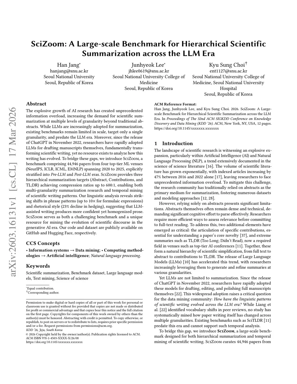 The explosive growth of AI research has created unprecedented information overload, increasing the demand for scientific summarization at multiple levels of granularity beyond traditional abstracts. While LLMs are increasingly adopted for summarization, existing benchmarks remain limited in scale, target only a single granularity, and predate the LLM era. Moreover, since the release of ChatGPT in November 2022, researchers have rapidly adopted LLMs for drafting manuscripts themselves, fundamentally transforming scientific writing, yet no resource exists to analyze how this writing has evolved. To bridge these gaps, we introduce SciZoom, a benchmark comprising 44,946 papers from four top-tier ML venues (NeurIPS, ICLR, ICML, EMNLP) spanning 2020 to 2025, explicitly stratified into Pre-LLM and Post-LLM eras. SciZoom provides three hierarchical summarization targets (Abstract, Contributions, and TL;DR) achieving compression ratios up to 600:1, enabling both multi-granularity summarization research and temporal mining of scientific writing patterns. Our linguistic analysis reveals striking shifts in phrase patterns (up to 10x for formulaic expressions) and rhetorical style (23% decline in hedging), suggesting that LLM-assisted writing produces more confident yet homogenized prose. SciZoom serves as both a challenging benchmark and a unique resource for mining the evolution of scientific discourse in the generative AI era. Our code and dataset are publicly available on GitHub (this https URL) and Hugging Face (this https URL), respectively.