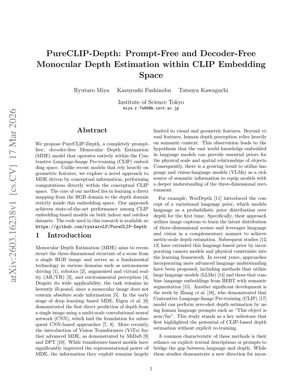 We propose PureCLIP-Depth, a completely prompt-free, decoder-free Monocular Depth Estimation (MDE) model that operates entirely within the Contrastive Language-Image Pre-training (CLIP) embedding space. Unlike recent models that rely heavily on geometric features, we explore a novel approach to MDE driven by conceptual information, performing computations directly within the conceptual CLIP space. The core of our method lies in learning a direct mapping from the RGB domain to the depth domain strictly inside this embedding space. Our approach achieves state-of-the-art performance among CLIP embedding-based models on both indoor and outdoor datasets. The code used in this research is available at:this https URL