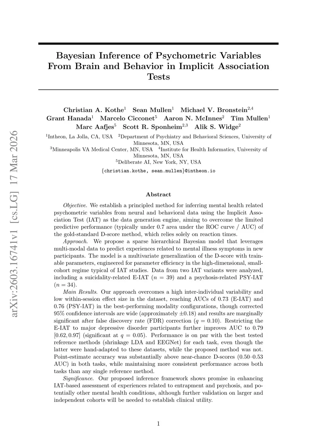 Objective. We establish a principled method for inferring mental health related psychometric variables from neural and behavioral data using the Implicit Association Test (IAT) as the data generation engine, aiming to overcome the limited predictive performance (typically under 0.7 AUC) of the gold-standard D-score method, which relies solely on reaction times.Approach. We propose a sparse hierarchical Bayesian model that leverages multi-modal data to predict experiences related to mental illness symptoms in new participants. The model is a multivariate generalization of the D-score with trainable parameters, engineered for parameter efficiency in the small-cohort regime typical of IAT studies. Data from two IAT variants were analyzed: a suicidality-related E-IAT () and a psychosis-related PSY-IAT ().Main Results. Our approach overcomes a high inter-individual variability and low within-session effect size in the dataset, reaching AUCs of 0.73 (E-IAT) and 0.76 (PSY-IAT) in the best modality configurations, though corrected 95% confidence intervals are wide () and results are marginally significant after FDR correction (). Restricting the E-IAT to MDD participants improves AUC to 0.79 (significant at ). Performance is on par with the best reference methods (shrinkage LDA and EEGNet) for each task, even when the latter were adapted to the task, while the proposed method was not. Accuracy was substantially above near-chance D-scores (0.50-0.53 AUC) in both tasks, with more consistent cross-task performance than any single reference method.Significance. Our framework shows promise for enhancing IAT-based assessment of experiences related to entrapment and psychosis, and potentially other mental health conditions, though further validation on larger and independent cohorts will be needed to establish clinical utility.