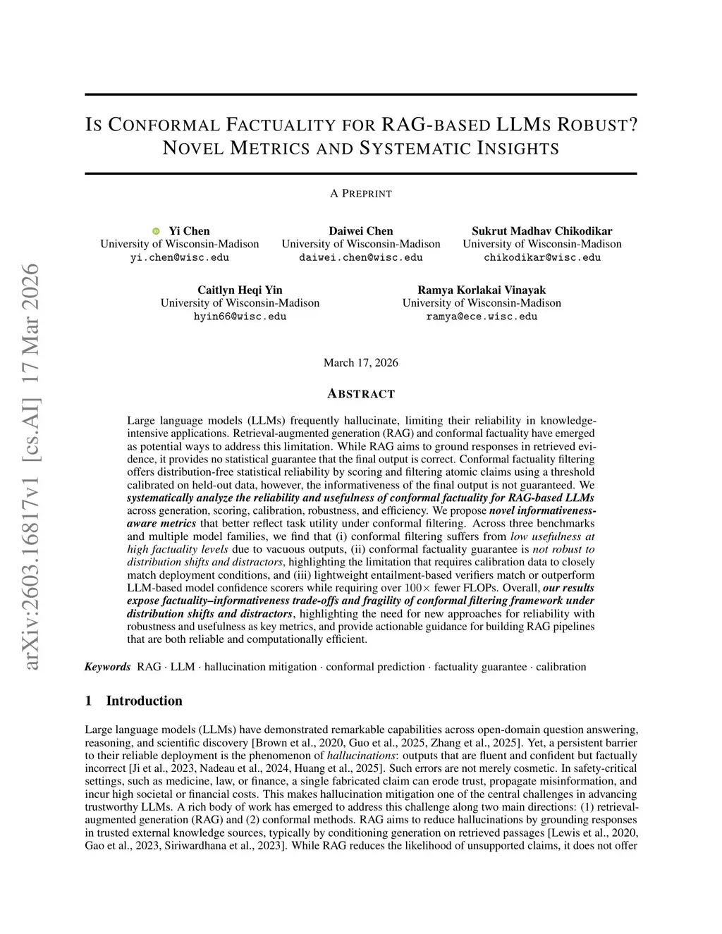 Large language models (LLMs) frequently hallucinate, limiting their reliability in knowledge-intensive applications. Retrieval-augmented generation (RAG) and conformal factuality have emerged as potential ways to address this limitation. While RAG aims to ground responses in retrieved evidence, it provides no statistical guarantee that the final output is correct. Conformal factuality filtering offers distribution-free statistical reliability by scoring and filtering atomic claims using a threshold calibrated on held-out data, however, the informativeness of the final output is not guaranteed. We systematically analyze the reliability and usefulness of conformal factuality for RAG-based LLMs across generation, scoring, calibration, robustness, and efficiency. We propose novel informativeness-aware metrics that better reflect task utility under conformal filtering. Across three benchmarks and multiple model families, we find that (i) conformal filtering suffers from low usefulness at high factuality levels due to vacuous outputs, (ii) conformal factuality guarantee is not robust to distribution shifts and distractors, highlighting the limitation that requires calibration data to closely match deployment conditions, and (iii) lightweight entailment-based verifiers match or outperform LLM-based model confidence scorers while requiring over fewer FLOPs. Overall, our results expose factuality-informativeness trade-offs and fragility of conformal filtering framework under distribution shifts and distractors, highlighting the need for new approaches for reliability with robustness and usefulness as key metrics, and provide actionable guidance for building RAG pipelines that are both reliable and computationally efficient.