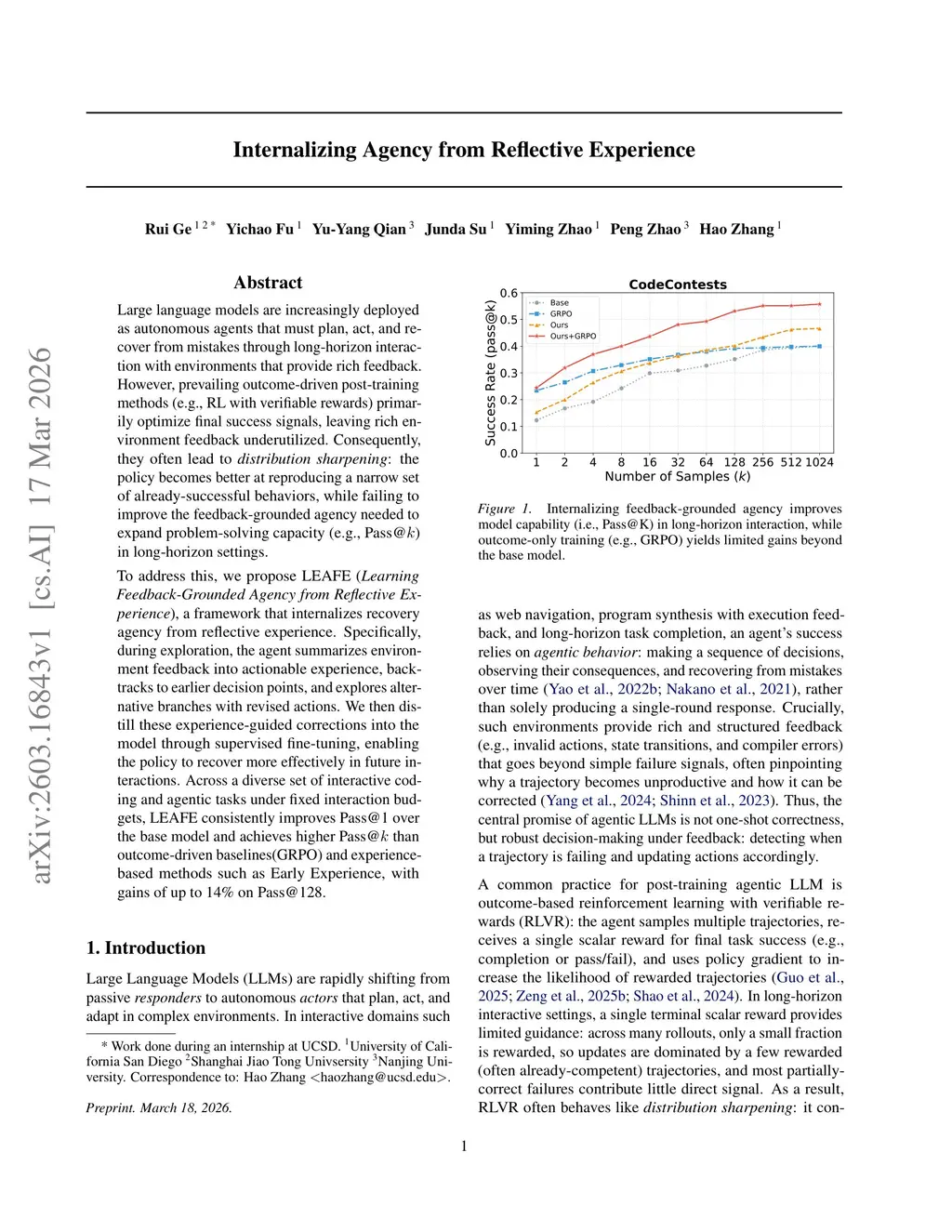 Large language models are increasingly deployed as autonomous agents that must plan, act, and recover from mistakes through long-horizon interaction with environments that provide rich feedback. However, prevailing outcome-driven post-training methods (e.g., RL with verifiable rewards) primarily optimize final success signals, leaving rich environment feedback underutilized. Consequently, they often lead to distribution sharpening: the policy becomes better at reproducing a narrow set of already-successful behaviors, while failing to improve the feedback-grounded agency needed to expand problem-solving capacity (e.g., Pass@k) in long-horizon settings.To address this, we propose LEAFE (Learning Feedback-Grounded Agency from Reflective Experience), a framework that internalizes recovery agency from reflective experience. Specifically, during exploration, the agent summarizes environment feedback into actionable experience, backtracks to earlier decision points, and explores alternative branches with revised actions. We then distill these experience-guided corrections into the model through supervised fine-tuning, enabling the policy to recover more effectively in future interactions. Across a diverse set of interactive coding and agentic tasks under fixed interaction budgets, LEAFE consistently improves Pass@1 over the base model and achieves higher Pass@k than outcome-driven baselines (GRPO) and experience-based methods such as Early Experience, with gains of up to 14% on Pass@128.