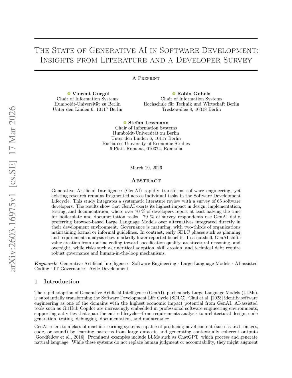 Generative Artificial Intelligence (GenAI) rapidly transforms software engineering, yet existing research remains fragmented across individual tasks in the Software Development Lifecycle. This study integrates a systematic literature review with a survey of 65 software developers. The results show that GenAI exerts its highest impact in design, implementation, testing, and documentation, where over 70 % of developers report at least halving the time for boilerplate and documentation tasks. 79 % of survey respondents use GenAI daily, preferring browser-based Large Language Models over alternatives integrated directly in their development environment. Governance is maturing, with two-thirds of organizations maintaining formal or informal guidelines. In contrast, early SDLC phases such as planning and requirements analysis show markedly lower reported benefits. In a nutshell, GenAI shifts value creation from routine coding toward specification quality, architectural reasoning, and oversight, while risks such as uncritical adoption, skill erosion, and technical debt require robust governance and human-in-the-loop mechanisms.