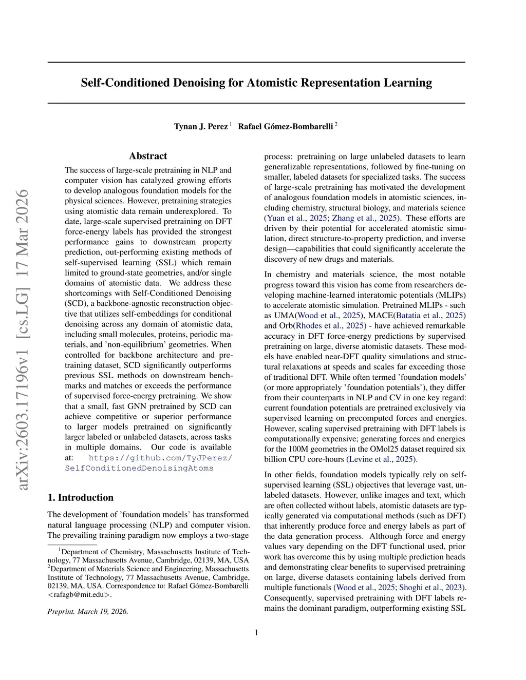 The success of large-scale pretraining in NLP and computer vision has catalyzed growing efforts to develop analogous foundation models for the physical sciences. However, pretraining strategies using atomistic data remain underexplored. To date, large-scale supervised pretraining on DFT force-energy labels has provided the strongest performance gains to downstream property prediction, out-performing existing methods of self-supervised learning (SSL) which remain limited to ground-state geometries, and/or single domains of atomistic data. We address these shortcomings with Self-Conditioned Denoising (SCD), a backbone-agnostic reconstruction objective that utilizes self-embeddings for conditional denoising across any domain of atomistic data, including small molecules, proteins, periodic materials, and ñon-equilibrium' geometries. When controlled for backbone architecture and pretraining dataset, SCD significantly outperforms previous SSL methods on downstream benchmarks and matches or exceeds the performance of supervised force-energy pretraining. We show that a small, fast GNN pretrained by SCD can achieve competitive or superior performance to larger models pretrained on significantly larger labeled or unlabeled datasets, across tasks in multiple domains. Our code is available at:this https URL