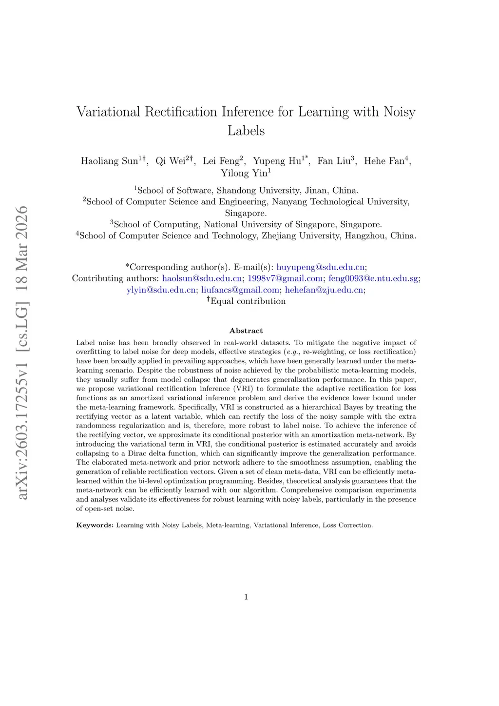 Label noise has been broadly observed in real-world datasets. To mitigate the negative impact of overfitting to label noise for deep models, effective strategies (\textit{e.g.}, re-weighting, or loss rectification) have been broadly applied in prevailing approaches, which have been generally learned under the meta-learning scenario. Despite the robustness of noise achieved by the probabilistic meta-learning models, they usually suffer from model collapse that degenerates generalization performance. In this paper, we propose variational rectification inference (VRI) to formulate the adaptive rectification for loss functions as an amortized variational inference problem and derive the evidence lower bound under the meta-learning framework. Specifically, VRI is constructed as a hierarchical Bayes by treating the rectifying vector as a latent variable, which can rectify the loss of the noisy sample with the extra randomness regularization and is, therefore, more robust to label noise. To achieve the inference of the rectifying vector, we approximate its conditional posterior with an amortization meta-network. By introducing the variational term in VRI, the conditional posterior is estimated accurately and avoids collapsing to a Dirac delta function, which can significantly improve the generalization performance. The elaborated meta-network and prior network adhere to the smoothness assumption, enabling the generation of reliable rectification vectors. Given a set of clean meta-data, VRI can be efficiently meta-learned within the bi-level optimization programming. Besides, theoretical analysis guarantees that the meta-network can be efficiently learned with our algorithm. Comprehensive comparison experiments and analyses validate its effectiveness for robust learning with noisy labels, particularly in the presence of open-set noise.