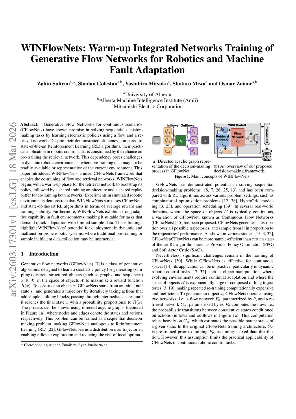 WINFlowNets: Warm-up Integrated Networks Training of Generative Flow Networks for Robotics and Machine Fault Adaptation