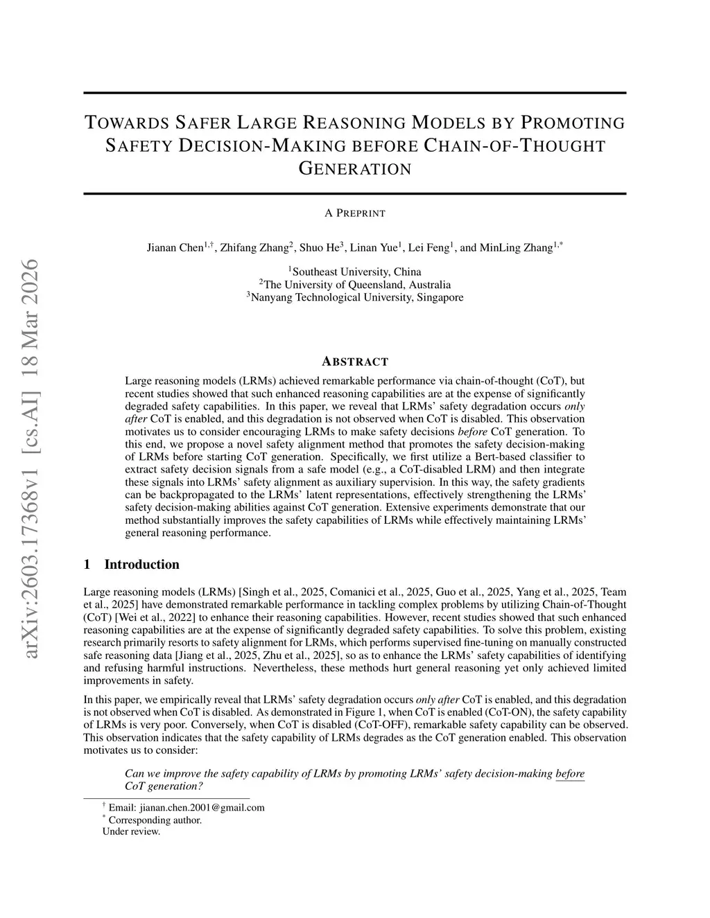 Large reasoning models (LRMs) achieved remarkable performance via chain-of-thought (CoT), but recent studies showed that such enhanced reasoning capabilities are at the expense of significantly degraded safety capabilities. In this paper, we reveal that LRMs' safety degradation occurs only after CoT is enabled, and this degradation is not observed when CoT is disabled. This observation motivates us to consider encouraging LRMs to make safety decisions before CoT generation. To this end, we propose a novel safety alignment method that promotes the safety decision-making of LRMs before starting CoT generation. Specifically, we first utilize a Bert-based classifier to extract safety decision signals from a safe model (e.g., a CoT-disabled LRM) and then integrate these signals into LRMs' safety alignment as auxiliary supervision. In this way, the safety gradients can be backpropagated to the LRMs' latent representations, effectively strengthening the LRMs' safety decision-making abilities against CoT generation. Extensive experiments demonstrate that our method substantially improves the safety capabilities of LRMs while effectively maintaining LRMs' general reasoning performance.