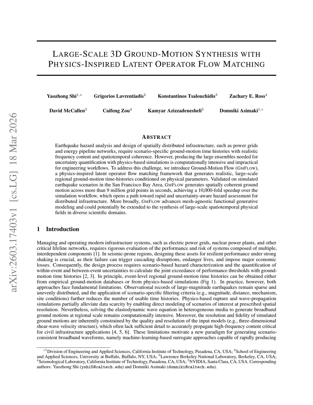 Earthquake hazard analysis and design of spatially distributed infrastructure, such as power grids and energy pipeline networks, require scenario-specific ground-motion time histories with realistic frequency content and spatiotemporal coherence. However, producing the large ensembles needed for uncertainty quantification with physics-based simulations is computationally intensive and impractical for engineering workflows. To address this challenge, we introduce Ground-Motion Flow (GMFlow), a physics-inspired latent operator flow matching framework that generates realistic, large-scale regional ground-motion time-histories conditioned on physical parameters. Validated on simulated earthquake scenarios in the San Francisco Bay Area, GMFlow generates spatially coherent ground motion across more than 9 million grid points in seconds, achieving a 10,000-fold speedup over the simulation workflow, which opens a path toward rapid and uncertainty-aware hazard assessment for distributed infrastructure. More broadly, GMFlow advances mesh-agnostic functional generative modeling and could potentially be extended to the synthesis of large-scale spatiotemporal physical fields in diverse scientific domains.