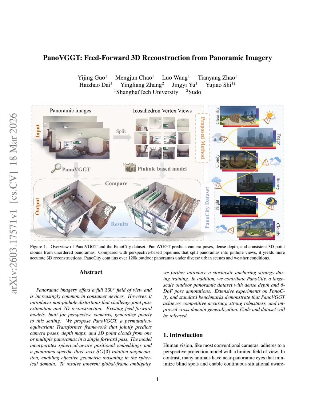 Panoramic imagery offers a full 360° field of view and is increasingly common in consumer devices. However, it introduces non-pinhole distortions that challenge joint pose estimation and 3D reconstruction. Existing feed-forward models, built for perspective cameras, generalize poorly to this setting. We propose PanoVGGT, a permutation-equivariant Transformer framework that jointly predicts camera poses, depth maps, and 3D point clouds from one or multiple panoramas in a single forward pass. The model incorporates spherical-aware positional embeddings and a panorama-specific three-axis SO(3) rotation augmentation, enabling effective geometric reasoning in the spherical domain. To resolve inherent global-frame ambiguity, we further introduce a stochastic anchoring strategy during training. In addition, we contribute PanoCity, a large-scale outdoor panoramic dataset with dense depth and 6-DoF pose annotations. Extensive experiments on PanoCity and standard benchmarks demonstrate that PanoVGGT achieves competitive accuracy, strong robustness, and improved cross-domain generalization. Code and dataset will be released.