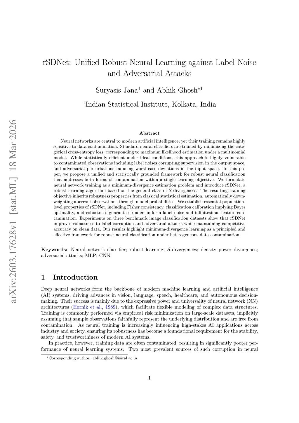 Neural networks are central to modern artificial intelligence, yet their training remains highly sensitive to data contamination. Standard neural classifiers are trained by minimizing the categorical cross-entropy loss, corresponding to maximum likelihood estimation under a multinomial model. While statistically efficient under ideal conditions, this approach is highly vulnerable to contaminated observations including label noises corrupting supervision in the output space, and adversarial perturbations inducing worst-case deviations in the input space. In this paper, we propose a unified and statistically grounded framework for robust neural classification that addresses both forms of contamination within a single learning objective. We formulate neural network training as a minimum-divergence estimation problem and introduce rSDNet, a robust learning algorithm based on the general class of -divergences. The resulting training objective inherits robustness properties from classical statistical estimation, automatically down-weighting aberrant observations through model probabilities. We establish essential population-level properties of rSDNet, including Fisher consistency, classification calibration implying Bayes optimality, and robustness guarantees under uniform label noise and infinitesimal feature contamination. Experiments on three benchmark image classification datasets show that rSDNet improves robustness to label corruption and adversarial attacks while maintaining competitive accuracy on clean data, Our results highlight minimum-divergence learning as a principled and effective framework for robust neural classification under heterogeneous data contamination.