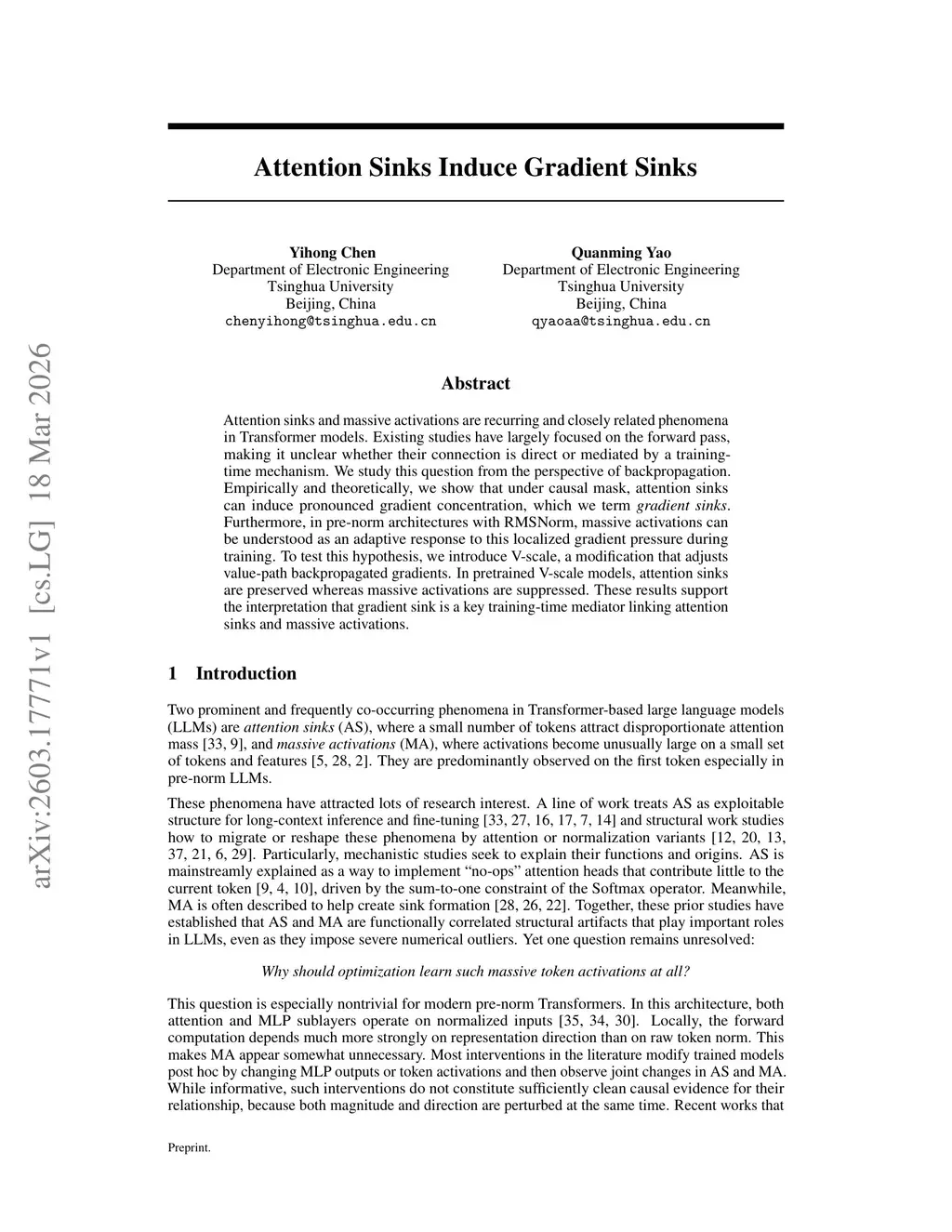 Attention sinks and massive activations are recurring and closely related phenomena in Transformer models. Existing studies have largely focused on the forward pass, making it unclear whether their connection is direct or mediated by a training-time mechanism. We study this question from the perspective of backpropagation. Empirically and theoretically, we show that under causal mask, attention sinks can induce pronounced gradient concentration, which we term gradient sinks. Furthermore, in pre-norm architectures with RMSNorm, massive activations can be understood as an adaptive response to this localized gradient pressure during training. To test this hypothesis, we introduce V-scale, a modification that adjusts value-path backpropagated gradients. In pretrained V-scale models, attention sinks are preserved whereas massive activations are suppressed. These results support the interpretation that gradient sink is a key training-time mediator linking attention sinks and massive activations.