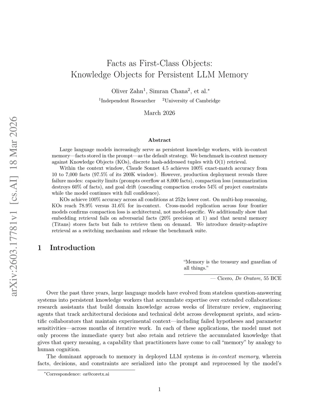 Large language models increasingly serve as persistent knowledge workers, with in-context memory - facts stored in the prompt - as the default strategy. We benchmark in-context memory against Knowledge Objects (KOs), discrete hash-addressed tuples with O(1) retrieval. Within the context window, Claude Sonnet 4.5 achieves 100% exact-match accuracy from 10 to 7,000 facts (97.5% of its 200K window). However, production deployment reveals three failure modes: capacity limits (prompts overflow at 8,000 facts), compaction loss (summarization destroys 60% of facts), and goal drift (cascading compaction erodes 54% of project constraints while the model continues with full confidence). KOs achieve 100% accuracy across all conditions at 252x lower cost. On multi-hop reasoning, KOs reach 78.9% versus 31.6% for in-context. Cross-model replication across four frontier models confirms compaction loss is architectural, not model-specific. We additionally show that embedding retrieval fails on adversarial facts (20% precision at 1) and that neural memory (Titans) stores facts but fails to retrieve them on demand. We introduce density-adaptive retrieval as a switching mechanism and release the benchmark suite.