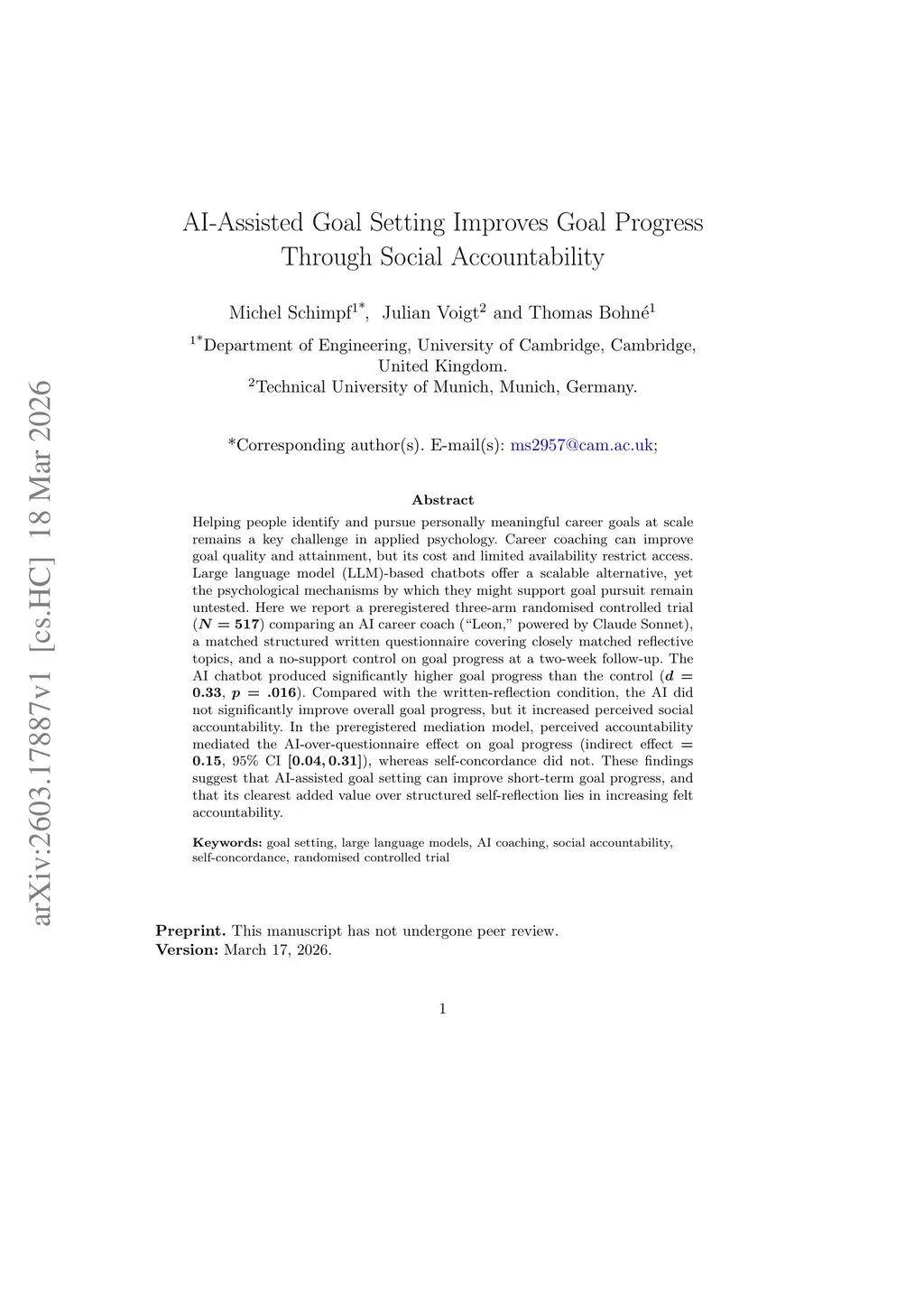 Helping people identify and pursue personally meaningful career goals at scale remains a key challenge in applied psychology. Career coaching can improve goal quality and attainment, but its cost and limited availability restrict access. Large language model (LLM)-based chatbots offer a scalable alternative, yet the psychological mechanisms by which they might support goal pursuit remain untested. Here we report a preregistered three-arm randomised controlled trial (N = 517) comparing an AI career coach ("Leon," powered by Claude Sonnet), a matched structured written questionnaire covering closely matched reflective topics, and a no-support control on goal progress at a two-week follow-up. The AI chatbot produced significantly higher goal progress than the control (d = 0.33, p = .016). Compared with the written-reflection condition, the AI did not significantly improve overall goal progress, but it increased perceived social accountability. In the preregistered mediation model, perceived accountability mediated the AI-over-questionnaire effect on goal progress (indirect effect = 0.15, 95% CI [0.04, 0.31]), whereas self-concordance did not. These findings suggest that AI-assisted goal setting can improve short-term goal progress, and that its clearest added value over structured self-reflection lies in increasing felt accountability.