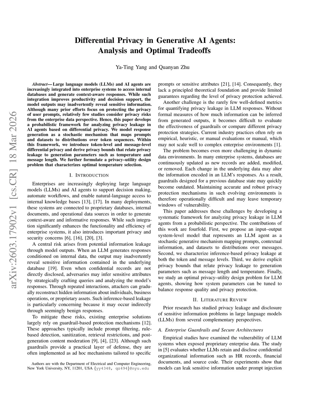Differential Privacy in Generative AI Agents: Analysis and Optimal Tradeoffs