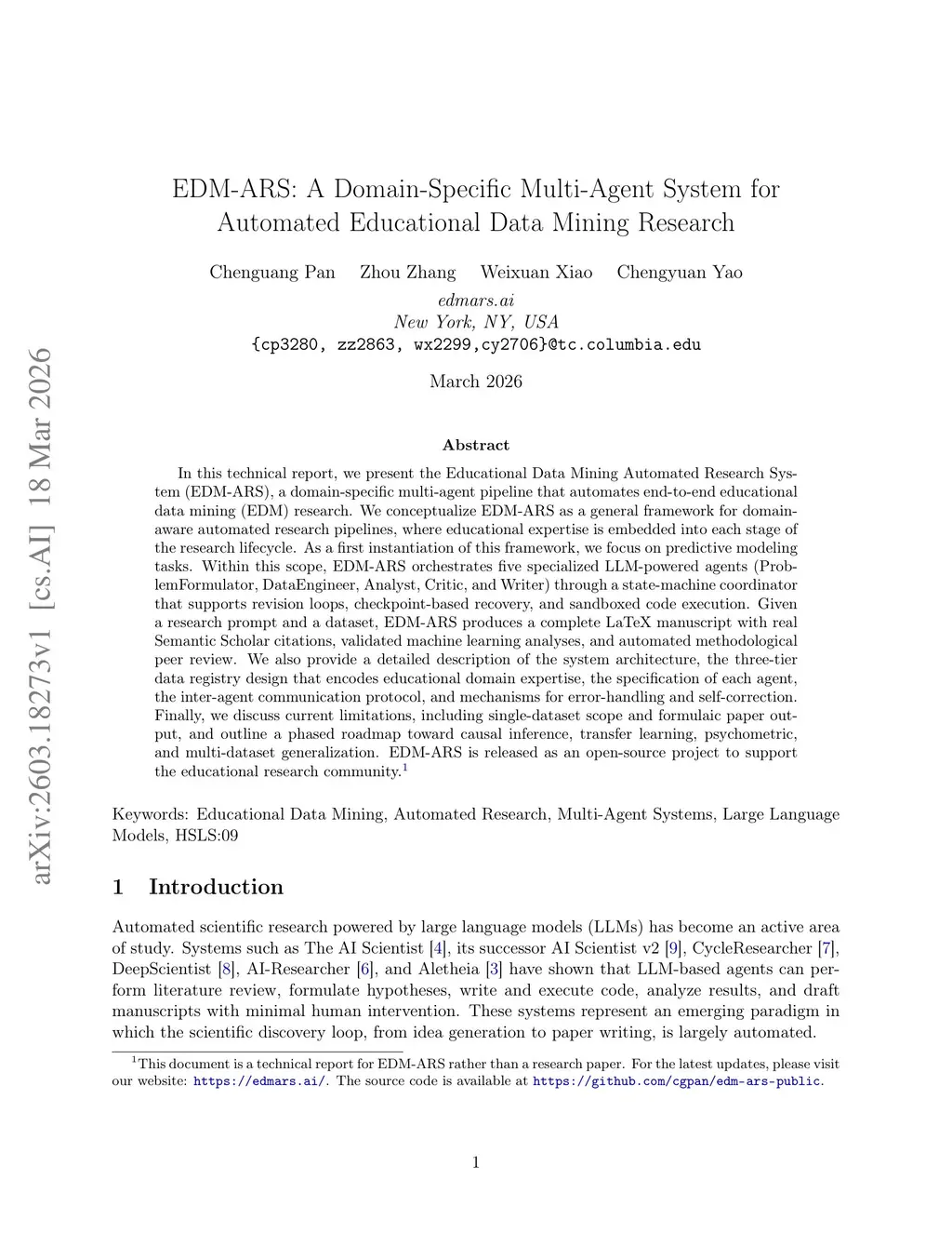 In this technical report, we present the Educational Data Mining Automated Research System (EDM-ARS), a domain-specific multi-agent pipeline that automates end-to-end educational data mining (EDM) research. We conceptualize EDM-ARS as a general framework for domain-aware automated research pipelines, where educational expertise is embedded into each stage of the research lifecycle. As a first instantiation of this framework, we focus on predictive modeling tasks. Within this scope, EDM-ARS orchestrates five specialized LLM-powered agents (ProblemFormulator, DataEngineer, Analyst, Critic, and Writer) through a state-machine coordinator that supports revision loops, checkpoint-based recovery, and sandboxed code execution. Given a research prompt and a dataset, EDM-ARS produces a complete LaTeX manuscript with real Semantic Scholar citations, validated machine learning analyses, and automated methodological peer review. We also provide a detailed description of the system architecture, the three-tier data registry design that encodes educational domain expertise, the specification of each agent, the inter-agent communication protocol, and mechanisms for error-handling and self-correction. Finally, we discuss current limitations, including single-dataset scope and formulaic paper output, and outline a phased roadmap toward causal inference, transfer learning, psychometric, and multi-dataset generalization. EDM-ARS is released as an open-source project to support the educational research community.