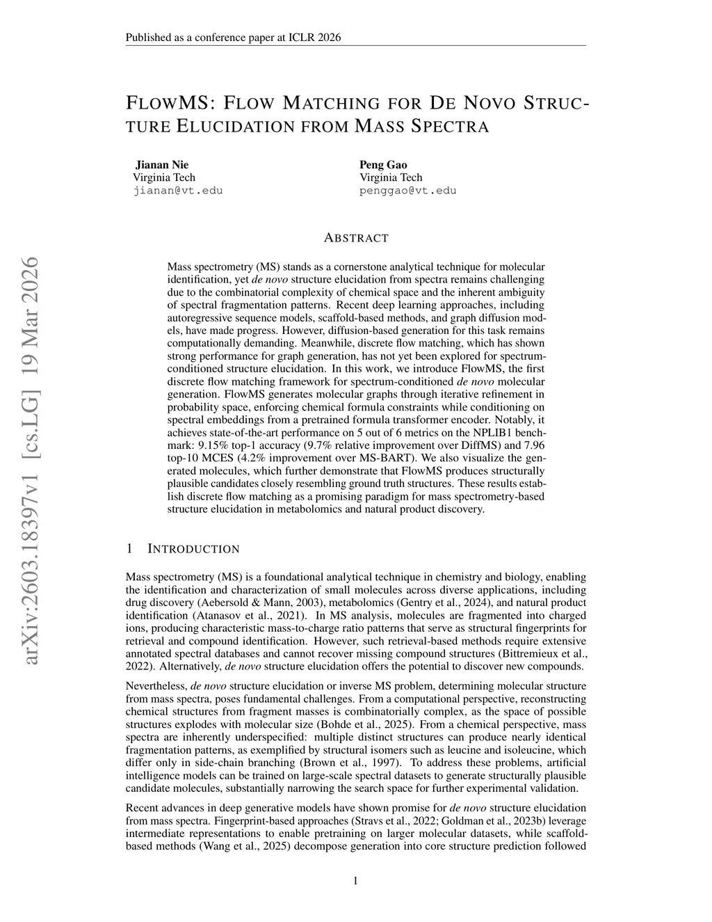 Mass spectrometry (MS) stands as a cornerstone analytical technique for molecular identification, yet de novo structure elucidation from spectra remains challenging due to the combinatorial complexity of chemical space and the inherent ambiguity of spectral fragmentation patterns. Recent deep learning approaches, including autoregressive sequence models, scaffold-based methods, and graph diffusion models, have made progress. However, diffusion-based generation for this task remains computationally demanding. Meanwhile, discrete flow matching, which has shown strong performance for graph generation, has not yet been explored for spectrum-conditioned structure elucidation. In this work, we introduce FlowMS, the first discrete flow matching framework for spectrum-conditioned de novo molecular generation. FlowMS generates molecular graphs through iterative refinement in probability space, enforcing chemical formula constraints while conditioning on spectral embeddings from a pretrained formula transformer encoder. Notably, it achieves state-of-the-art performance on 5 out of 6 metrics on the NPLIB1 benchmark: 9.15% top-1 accuracy (9.7% relative improvement over DiffMS) and 7.96 top-10 MCES (4.2% improvement over MS-BART). We also visualize the generated molecules, which further demonstrate that FlowMS produces structurally plausible candidates closely resembling ground truth structures. These results establish discrete flow matching as a promising paradigm for mass spectrometry-based structure elucidation in metabolomics and natural product discovery.