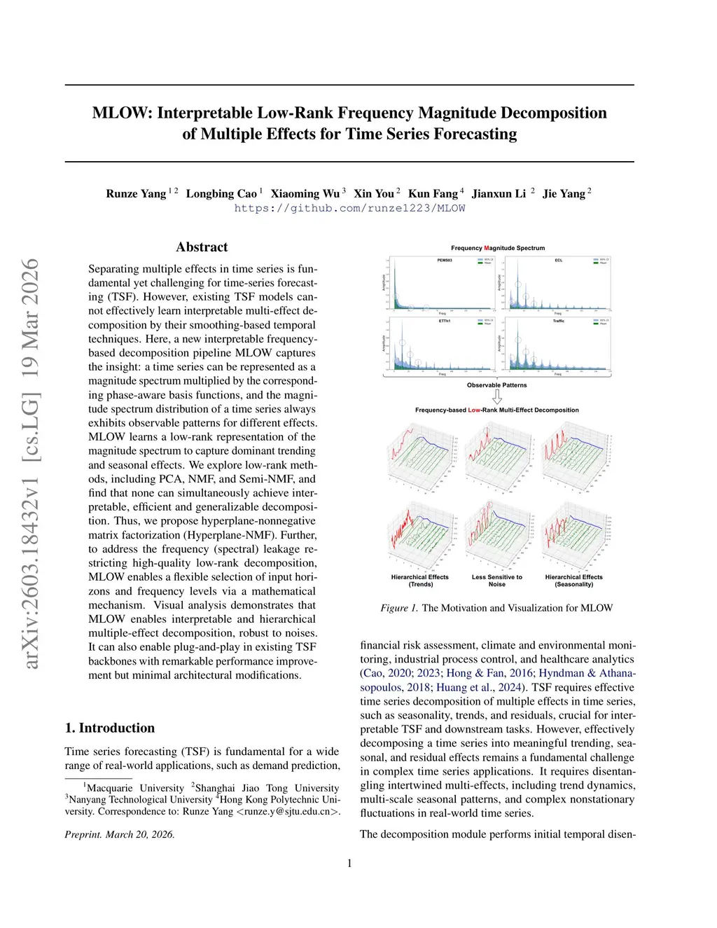MLOW: Interpretable Low-Rank Frequency Magnitude Decomposition of Multiple Effects for Time Series Forecasting