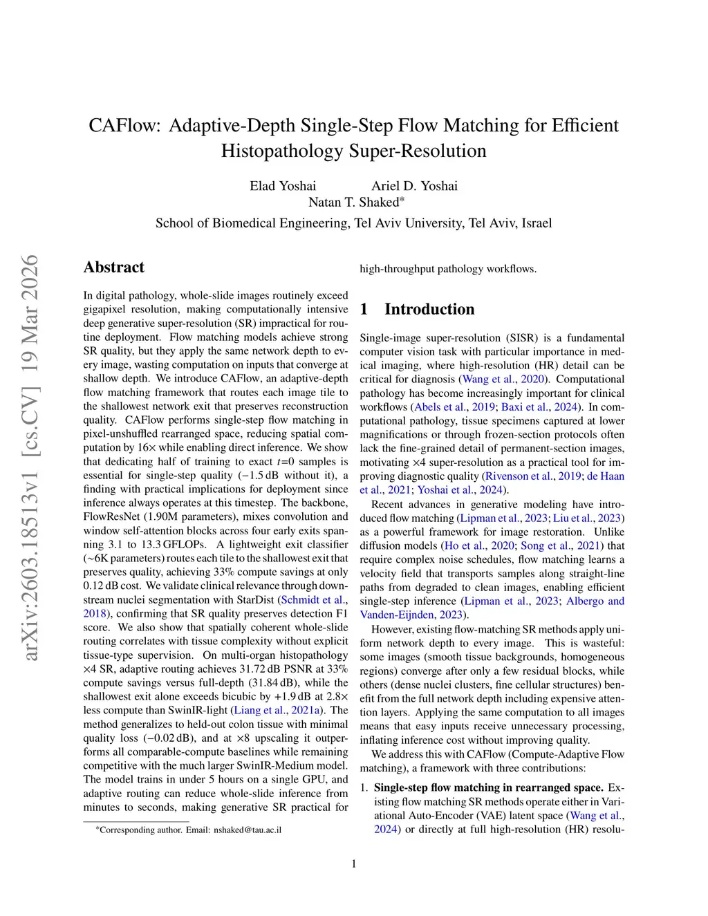 CAFlow: Adaptive-Depth Single-Step Flow Matching for Efficient Histopathology Super-Resolution