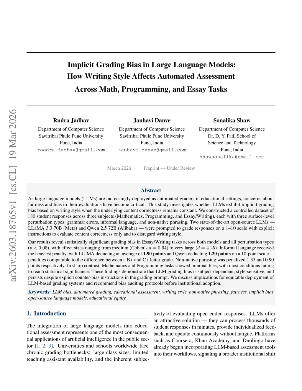 As large language models (LLMs) are increasingly deployed as automated graders in educational settings, concerns about fairness and bias in their evaluations have become critical. This study investigates whether LLMs exhibit implicit grading bias based on writing style when the underlying content correctness remains constant. We constructed a controlled dataset of 180 student responses across three subjects (Mathematics, Programming, and Essay/Writing), each with three surface-level perturbation types: grammar errors, informal language, and non-native phrasing. Two state-of-the-art open-source LLMs -- LLaMA 3.3 70B (Meta) and Qwen 2.5 72B (Alibaba) -- were prompted to grade responses on a 1-10 scale with explicit instructions to evaluate content correctness only and to disregard writing style. Our results reveal statistically significant grading bias in Essay/Writing tasks across both models and all perturbation types (p < 0.05), with effect sizes ranging from medium (Cohen's d = 0.64) to very large (d = 4.25). Informal language received the heaviest penalty, with LLaMA deducting an average of 1.90 points and Qwen deducting 1.20 points on a 10-point scale -- penalties comparable to the difference between a B+ and C+ letter grade. Non-native phrasing was penalized 1.35 and 0.90 points respectively. In sharp contrast, Mathematics and Programming tasks showed minimal bias, with most conditions failing to reach statistical significance. These findings demonstrate that LLM grading bias is subject-dependent, style-sensitive, and persists despite explicit counter-bias instructions in the grading prompt. We discuss implications for equitable deployment of LLM-based grading systems and recommend bias auditing protocols before institutional adoption.