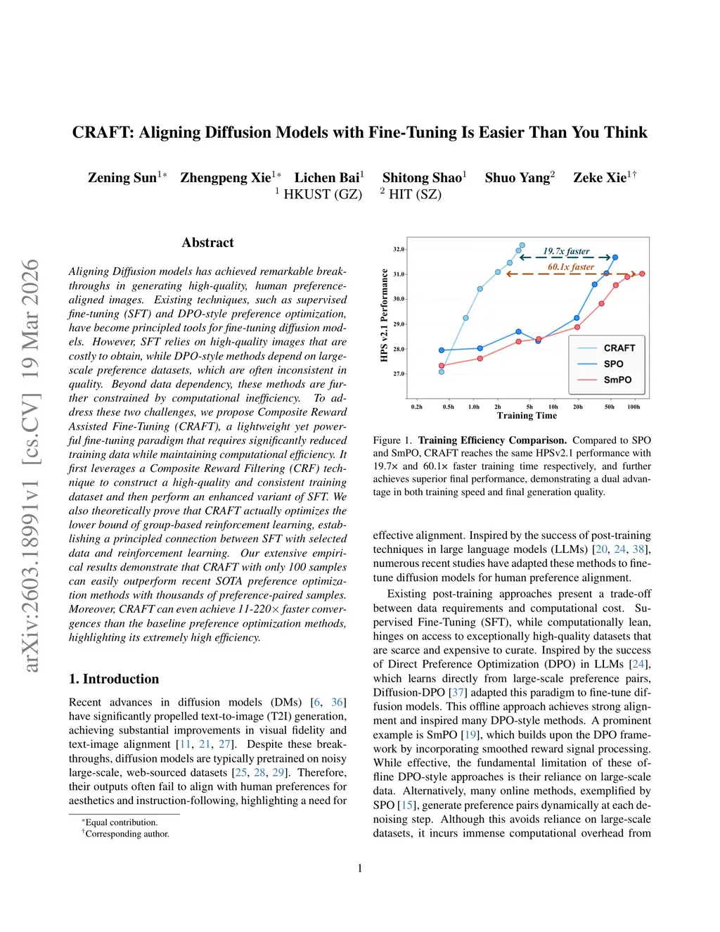 Aligning Diffusion models has achieved remarkable breakthroughs in generating high-quality, human preference-aligned images. Existing techniques, such as supervised fine-tuning (SFT) and DPO-style preference optimization, have become principled tools for fine-tuning diffusion models. However, SFT relies on high-quality images that are costly to obtain, while DPO-style methods depend on large-scale preference datasets, which are often inconsistent in quality. Beyond data dependency, these methods are further constrained by computational inefficiency. To address these two challenges, we propose Composite Reward Assisted Fine-Tuning (CRAFT), a lightweight yet powerful fine-tuning paradigm that requires significantly reduced training data while maintaining computational efficiency. It first leverages a Composite Reward Filtering (CRF) technique to construct a high-quality and consistent training dataset and then perform an enhanced variant of SFT. We also theoretically prove that CRAFT actually optimizes the lower bound of group-based reinforcement learning, establishing a principled connection between SFT with selected data and reinforcement learning. Our extensive empirical results demonstrate that CRAFT with only 100 samples can easily outperform recent SOTA preference optimization methods with thousands of preference-paired samples. Moreover, CRAFT can even achieve 11-220 faster convergences than the baseline preference optimization methods, highlighting its extremely high efficiency.