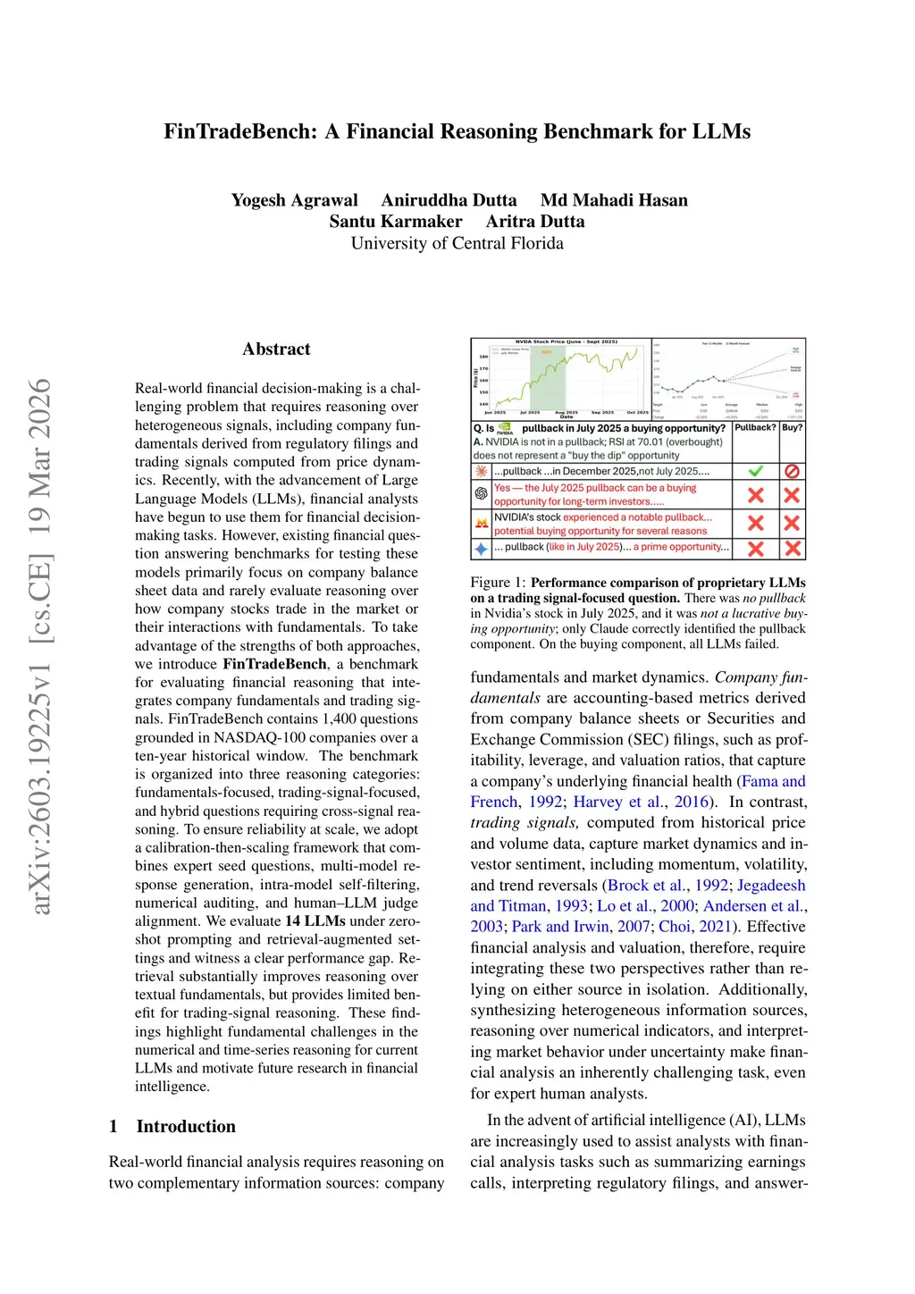 Real-world financial decision-making is a challenging problem that requires reasoning over heterogeneous signals, including company fundamentals derived from regulatory filings and trading signals computed from price dynamics. Recently, with the advancement of Large Language Models (LLMs), financial analysts have begun to use them for financial decision-making tasks. However, existing financial question answering benchmarks for testing these models primarily focus on company balance sheet data and rarely evaluate reasoning over how company stocks trade in the market or their interactions with fundamentals. To take advantage of the strengths of both approaches, we introduce FinTradeBench, a benchmark for evaluating financial reasoning that integrates company fundamentals and trading signals. FinTradeBench contains 1,400 questions grounded in NASDAQ-100 companies over a ten-year historical window. The benchmark is organized into three reasoning categories: fundamentals-focused, trading-signal-focused, and hybrid questions requiring cross-signal reasoning. To ensure reliability at scale, we adopt a calibration-then-scaling framework that combines expert seed questions, multi-model response generation, intra-model self-filtering, numerical auditing, and human-LLM judge alignment. We evaluate 14 LLMs under zero-shot prompting and retrieval-augmented settings and witness a clear performance gap. Retrieval substantially improves reasoning over textual fundamentals, but provides limited benefit for trading-signal reasoning. These findings highlight fundamental challenges in the numerical and time-series reasoning for current LLMs and motivate future research in financial intelligence.
