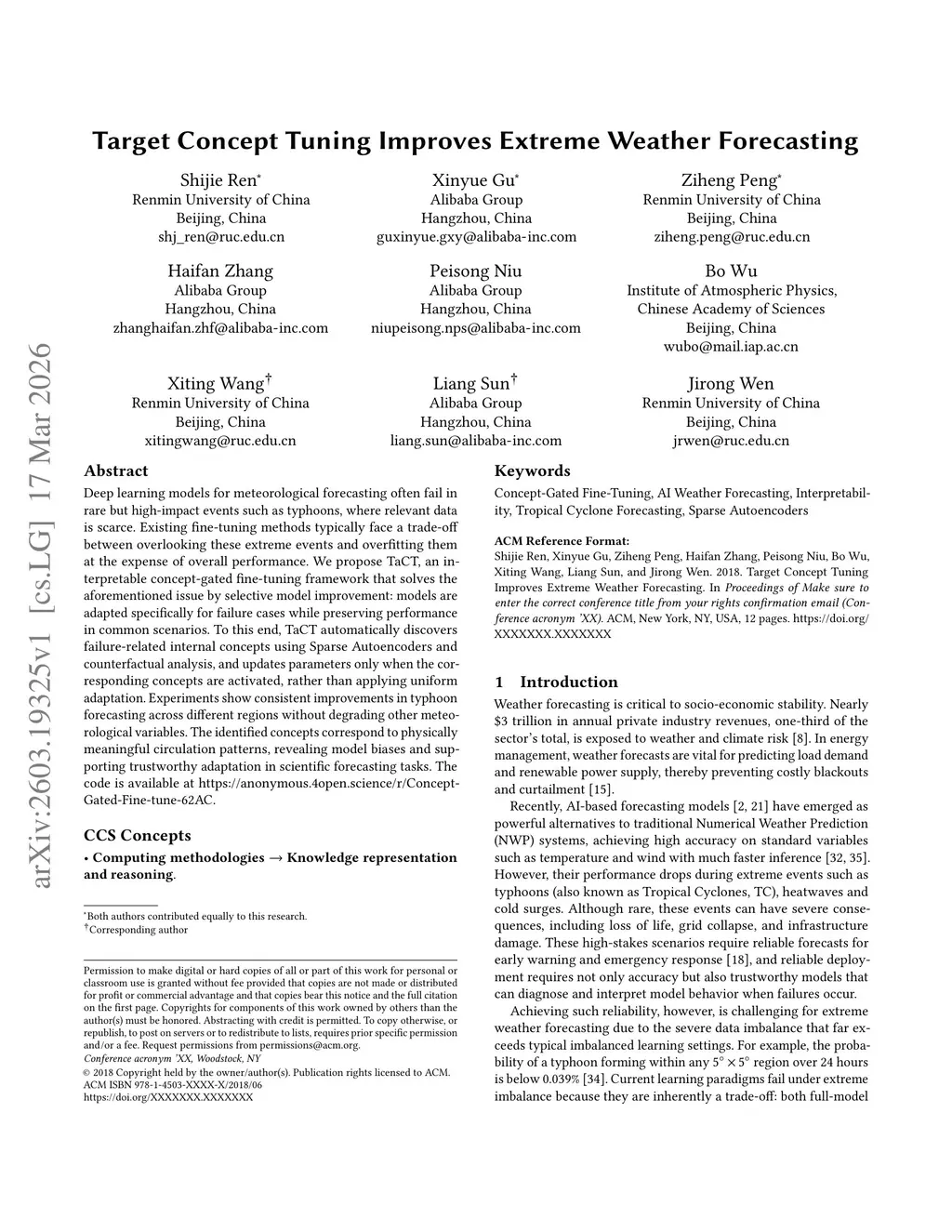 Deep learning models for meteorological forecasting often fail in rare but high-impact events such as typhoons, where relevant data is scarce. Existing fine-tuning methods typically face a trade-off between overlooking these extreme events and overfitting them at the expense of overall performance. We propose TaCT, an interpretable concept-gated fine-tuning framework that solves the aforementioned issue by selective model improvement: models are adapted specifically for failure cases while preserving performance in common scenarios. To this end, TaCT automatically discovers failure-related internal concepts using Sparse Autoencoders and counterfactual analysis, and updates parameters only when the corresponding concepts are activated, rather than applying uniform adaptation. Experiments show consistent improvements in typhoon forecasting across different regions without degrading other meteorological variables. The identified concepts correspond to physically meaningful circulation patterns, revealing model biases and supporting trustworthy adaptation in scientific forecasting tasks. The code is available atthis https URL.