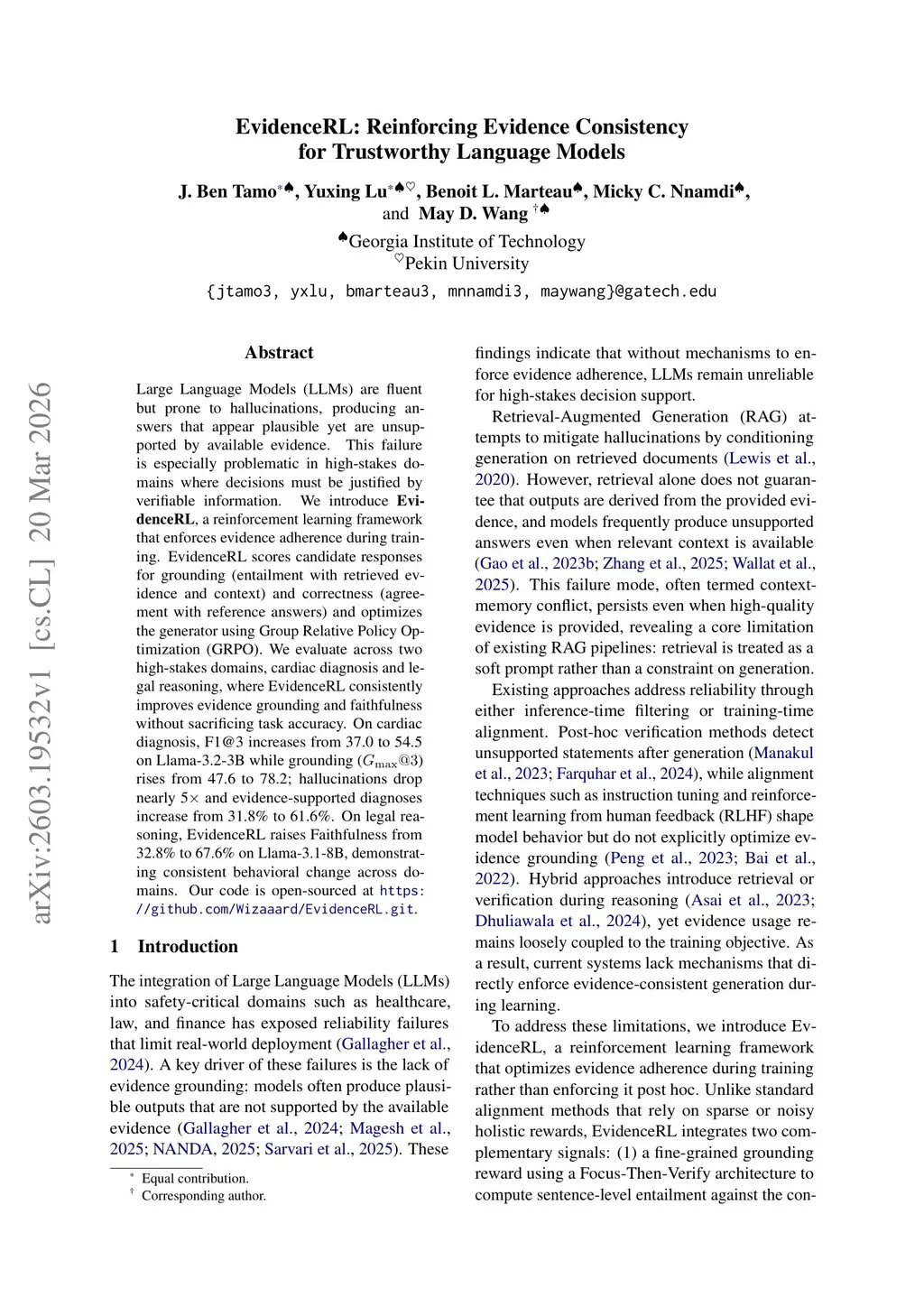 Large Language Models (LLMs) are fluent but prone to hallucinations, producing answers that appear plausible yet are unsupported by available evidence. This failure is especially problematic in high-stakes domains where decisions must be justified by verifiable information. We introduce \textbf{EvidenceRL}, a reinforcement learning framework that enforces evidence adherence during training. EvidenceRL scores candidate responses for grounding (entailment with retrieved evidence and context) and correctness (agreement with reference answers) and optimizes the generator using Group Relative Policy Optimization (GRPO). We evaluate across two high-stakes domains, cardiac diagnosis and legal reasoning, where EvidenceRL consistently improves evidence grounding and faithfulness without sacrificing task accuracy. On cardiac diagnosis, F1@3 increases from 37.0 to 54.5 on Llama-3.2-3B while grounding () rises from 47.6 to 78.2; hallucinations drop nearly 5 and evidence-supported diagnoses increase from 31.8\% to 61.6\%. On legal reasoning, EvidenceRL raises Faithfulness from 32.8\% to 67.6\% on Llama-3.1-8B, demonstrating consistent behavioral change across domains. Our code is open-sourced atthis https URL.
