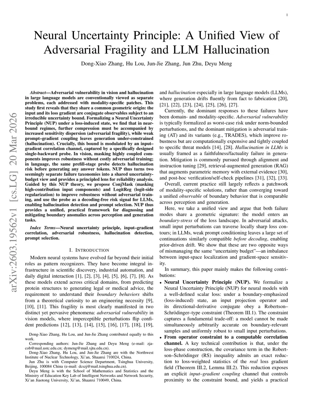 Adversarial vulnerability in vision and hallucination in large language models are conventionally viewed as separate problems, each addressed with modality-specific patches. This study first reveals that they share a common geometric origin: the input and its loss gradient are conjugate observables subject to an irreducible uncertainty bound. Formalizing a Neural Uncertainty Principle (NUP) under a loss-induced state, we find that in near-bound regimes, further compression must be accompanied by increased sensitivity dispersion (adversarial fragility), while weak prompt-gradient coupling leaves generation under-constrained (hallucination). Crucially, this bound is modulated by an input-gradient correlation channel, captured by a specifically designed single-backward probe. In vision, masking highly coupled components improves robustness without costly adversarial training; in language, the same prefill-stage probe detects hallucination risk before generating any answer tokens. NUP thus turns two seemingly separate failure taxonomies into a shared uncertainty-budget view and provides a principled lens for reliability analysis. Guided by this NUP theory, we propose ConjMask (masking high-contribution input components) and LogitReg (logit-side regularization) to improve robustness without adversarial training, and use the probe as a decoding-free risk signal for LLMs, enabling hallucination detection and prompt selection. NUP thus provides a unified, practical framework for diagnosing and mitigating boundary anomalies across perception and generation tasks.