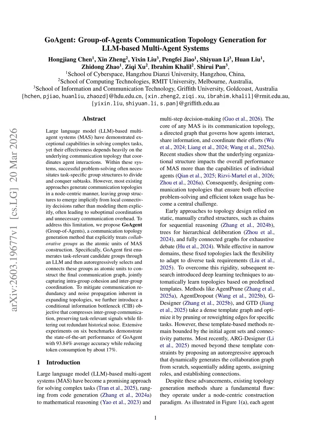Large language model (LLM)-based multi-agent systems (MAS) have demonstrated exceptional capabilities in solving complex tasks, yet their effectiveness depends heavily on the underlying communication topology that coordinates agent interactions. Within these systems, successful problem-solving often necessitates task-specific group structures to divide and conquer subtasks. However, most existing approaches generate communication topologies in a node-centric manner, leaving group structures to emerge implicitly from local connectivity decisions rather than modeling them explicitly, often leading to suboptimal coordination and unnecessary communication overhead. To address this limitation, we propose GoAgent (Group-of-Agents), a communication topology generation method that explicitly treats collaborative groups as the atomic units of MAS construction. Specifically, GoAgent first enumerates task-relevant candidate groups through an LLM and then autoregressively selects and connects these groups as atomic units to construct the final communication graph, jointly capturing intra-group cohesion and inter-group coordination. To mitigate communication redundancy and noise propagation inherent in expanding topologies, we further introduce a conditional information bottleneck (CIB) objective that compresses inter-group communication, preserving task-relevant signals while filtering out redundant historical noise. Extensive experiments on six benchmarks demonstrate the state-of-the-art performance of GoAgent with 93.84% average accuracy while reducing token consumption by about 17%.
