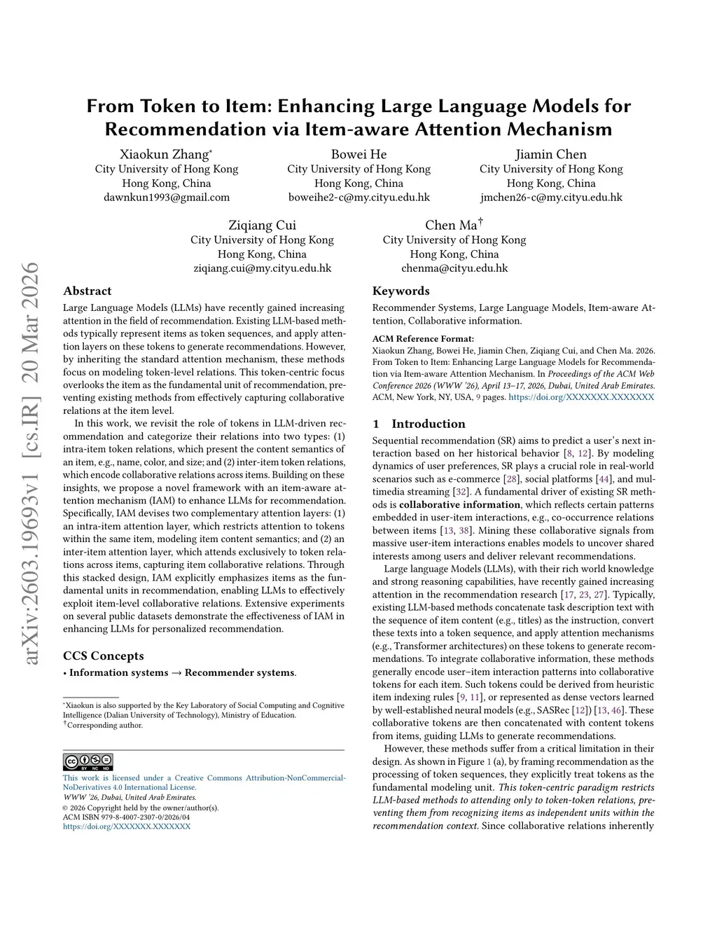 Large Language Models (LLMs) have recently gained increasing attention in the field of recommendation. Existing LLM-based methods typically represent items as token sequences, and apply attention layers on these tokens to generate recommendations. However, by inheriting the standard attention mechanism, these methods focus on modeling token-level relations. This token-centric focus overlooks the item as the fundamental unit of recommendation, preventing existing methods from effectively capturing collaborative relations at the item level. In this work, we revisit the role of tokens in LLM-driven recommendation and categorize their relations into two types: (1) intra-item token relations, which present the content semantics of an item, e.g., name, color, and size; and (2) inter-item token relations, which encode collaborative relations across items. Building on these insights, we propose a novel framework with an item-aware attention mechanism (IAM) to enhance LLMs for recommendation. Specifically, IAM devises two complementary attention layers: (1) an intra-item attention layer, which restricts attention to tokens within the same item, modeling item content semantics; and (2) an inter-item attention layer, which attends exclusively to token relations across items, capturing item collaborative relations. Through this stacked design, IAM explicitly emphasizes items as the fundamental units in recommendation, enabling LLMs to effectively exploit item-level collaborative relations. Extensive experiments on several public datasets demonstrate the effectiveness of IAM in enhancing LLMs for personalized recommendation.