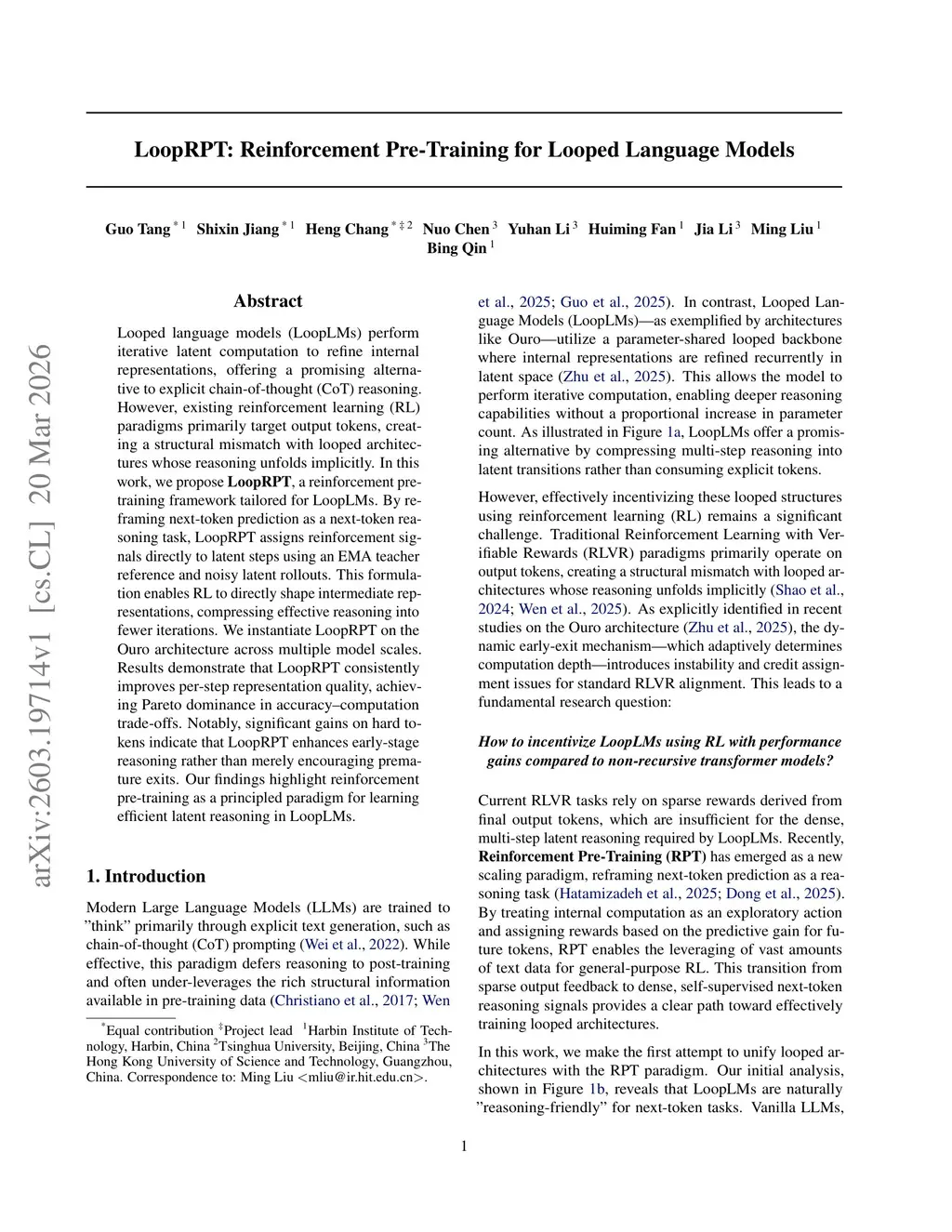 Looped language models (LoopLMs) perform iterative latent computation to refine internal representations, offering a promising alternative to explicit chain-of-thought (CoT) reasoning. However, existing reinforcement learning (RL) paradigms primarily target output tokens, creating a structural mismatch with looped architectures whose reasoning unfolds implicitly. In this work, we propose LoopRPT, a reinforcement pre-training framework tailored for LoopLMs. By reframing next-token prediction as a next-token reasoning task, LoopRPT assigns reinforcement signals directly to latent steps using an EMA teacher reference and noisy latent rollouts. This formulation enables RL to directly shape intermediate representations, compressing effective reasoning into fewer iterations. We instantiate LoopRPT on the Ouro architecture across multiple model scales. Results demonstrate that LoopRPT consistently improves per-step representation quality, achieving Pareto dominance in accuracy-computation trade-offs. Notably, significant gains on hard tokens indicate that LoopRPT enhances early-stage reasoning rather than merely encouraging premature exits. Our findings highlight reinforcement pre-training as a principled paradigm for learning efficient latent reasoning in LoopLMs.