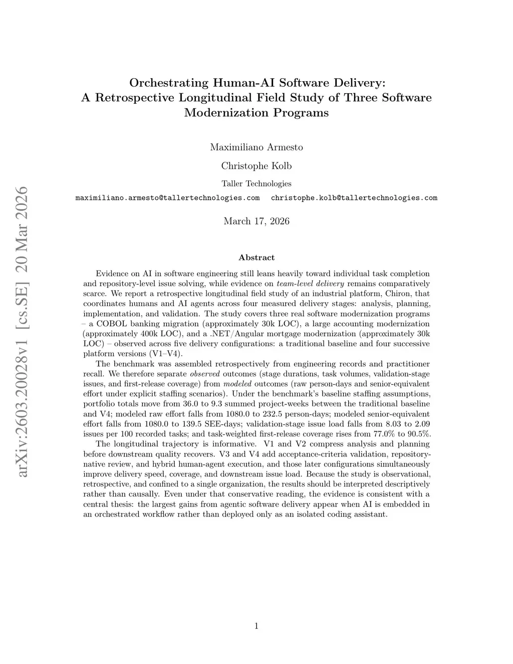 Evidence on AI in software engineering still leans heavily toward individual task completion, while evidence on team-level delivery remains scarce. We report a retrospective longitudinal field study of Chiron, an industrial platform that coordinates humans and AI agents across four delivery stages: analysis, planning, implementation, and validation. The study covers three real software modernization programs -- a COBOL banking migration (~30k LOC), a large accounting modernization (~400k LOC), and a .NET/Angular mortgage modernization (~30k LOC) -- observed across five delivery configurations: a traditional baseline and four successive platform versions (V1--V4). The benchmark separates observed outcomes (stage durations, task volumes, validation-stage issues, first-release coverage) from modeled outcomes (person-days and senior-equivalent effort under explicit staffing scenarios). Under baseline staffing assumptions, portfolio totals move from 36.0 to 9.3 summed project-weeks; modeled raw effort falls from 1080.0 to 232.5 person-days; modeled senior-equivalent effort falls from 1080.0 to 139.5 SEE-days; validation-stage issue load falls from 8.03 to 2.09 issues per 100 tasks; and first-release coverage rises from 77.0% to 90.5%. V3 and V4 add acceptance-criteria validation, repository-native review, and hybrid human-agent execution, simultaneously improving speed, coverage, and issue load. The evidence supports a central thesis: the largest gains appear when AI is embedded in an orchestrated workflow rather than deployed as an isolated coding assistant.