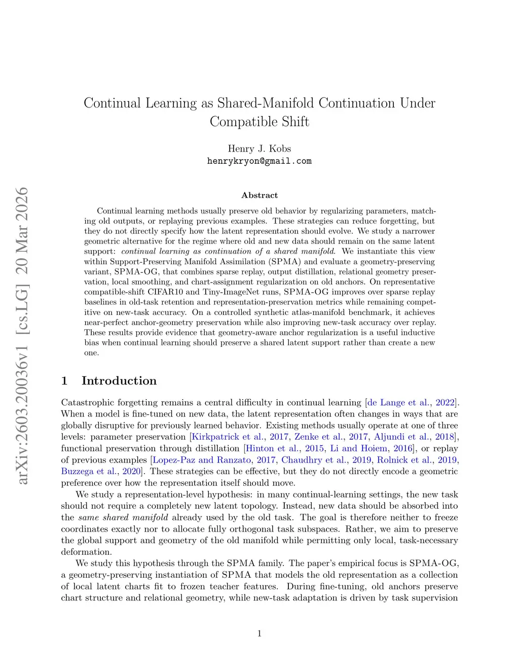 Continual learning methods usually preserve old behavior by regularizing parameters, matching old outputs, or replaying previous examples. These strategies can reduce forgetting, but they do not directly specify how the latent representation should evolve. We study a narrower geometric alternative for the regime where old and new data should remain on the same latent support: continual learning as continuation of a shared manifold. We instantiate this view within Support-Preserving Manifold Assimilation (SPMA) and evaluate a geometry-preserving variant, SPMA-OG, that combines sparse replay, output distillation, relational geometry preservation, local smoothing, and chart-assignment regularization on old anchors. On representative compatible-shift CIFAR10 and Tiny-ImageNet runs, SPMA-OG improves over sparse replay baselines in old-task retention and representation-preservation metrics while remaining competitive on new-task accuracy. On a controlled synthetic atlas-manifold benchmark, it achieves near-perfect anchor-geometry preservation while also improving new-task accuracy over replay. These results provide evidence that geometry-aware anchor regularization is a useful inductive bias when continual learning should preserve a shared latent support rather than create a new one.